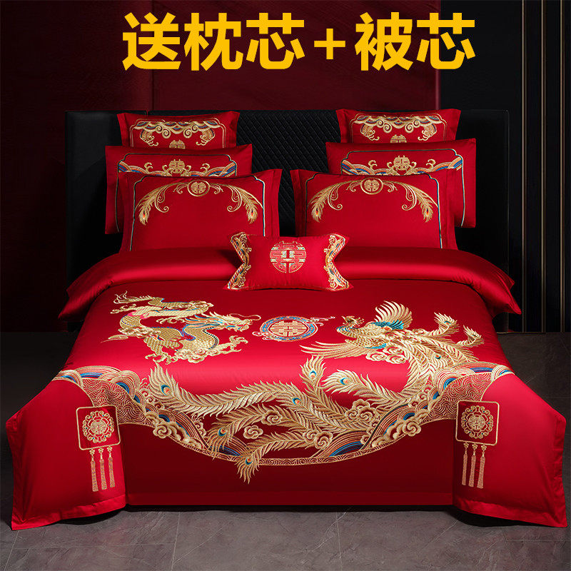 结婚全棉四件套大红色纯棉龙凤刺绣婚庆被子芯陪嫁新婚床上用品