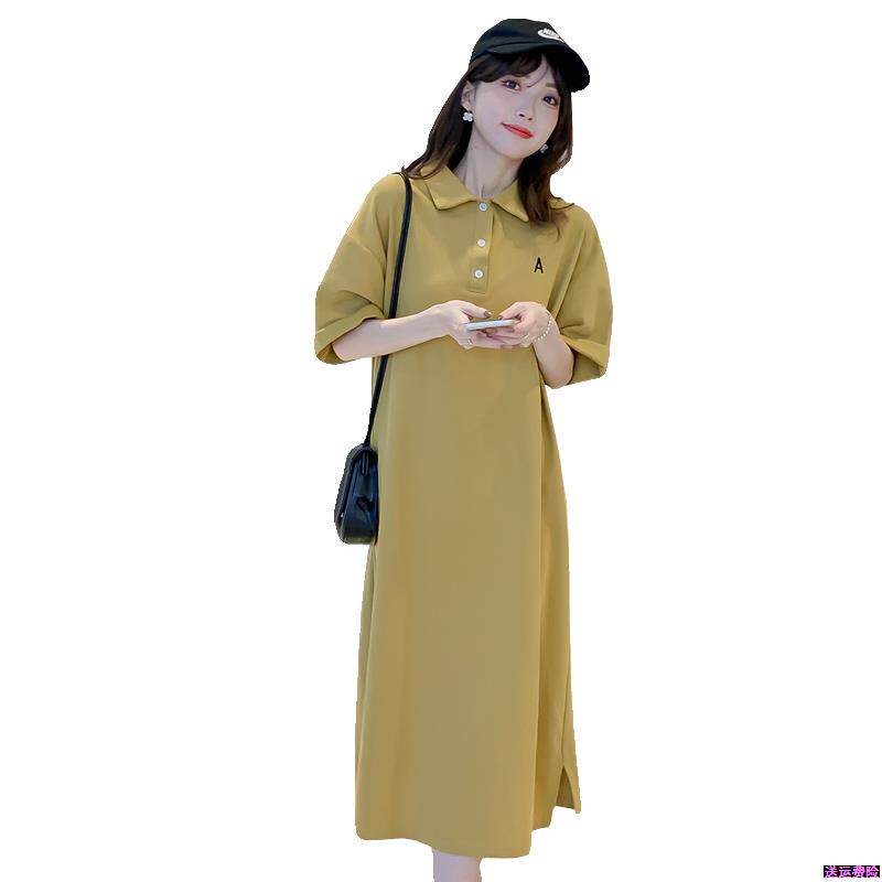 夏装韩版大码孕妇装宽松中长款连衣裙潮妈夏季短袖T恤翻领衬衣裙