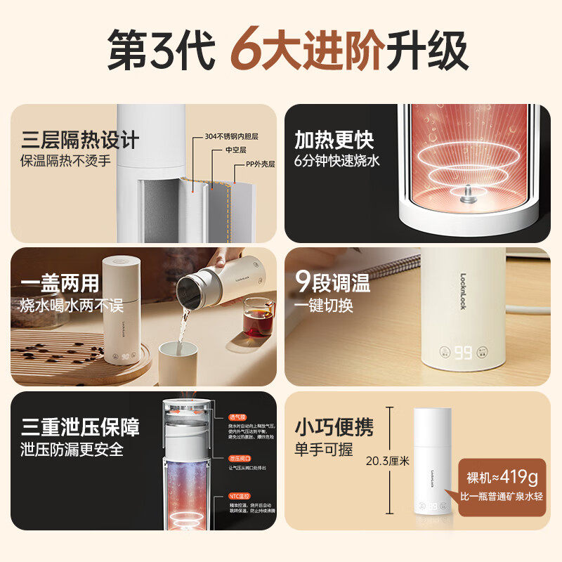 乐扣电热水杯烧水杯旅行便携式烧水壶加热保温杯加热水杯澳英欧规