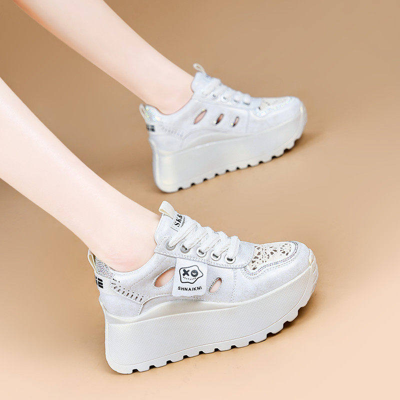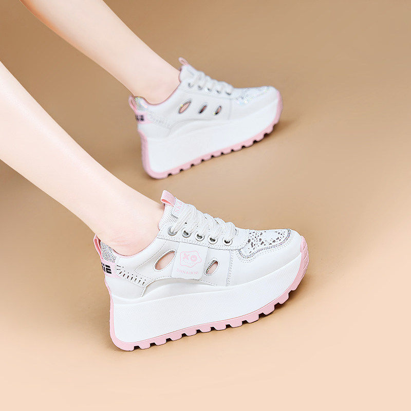 真皮镂空内增高女鞋8cm小个子网面透气运动鞋ins夏季坡跟休闲凉鞋