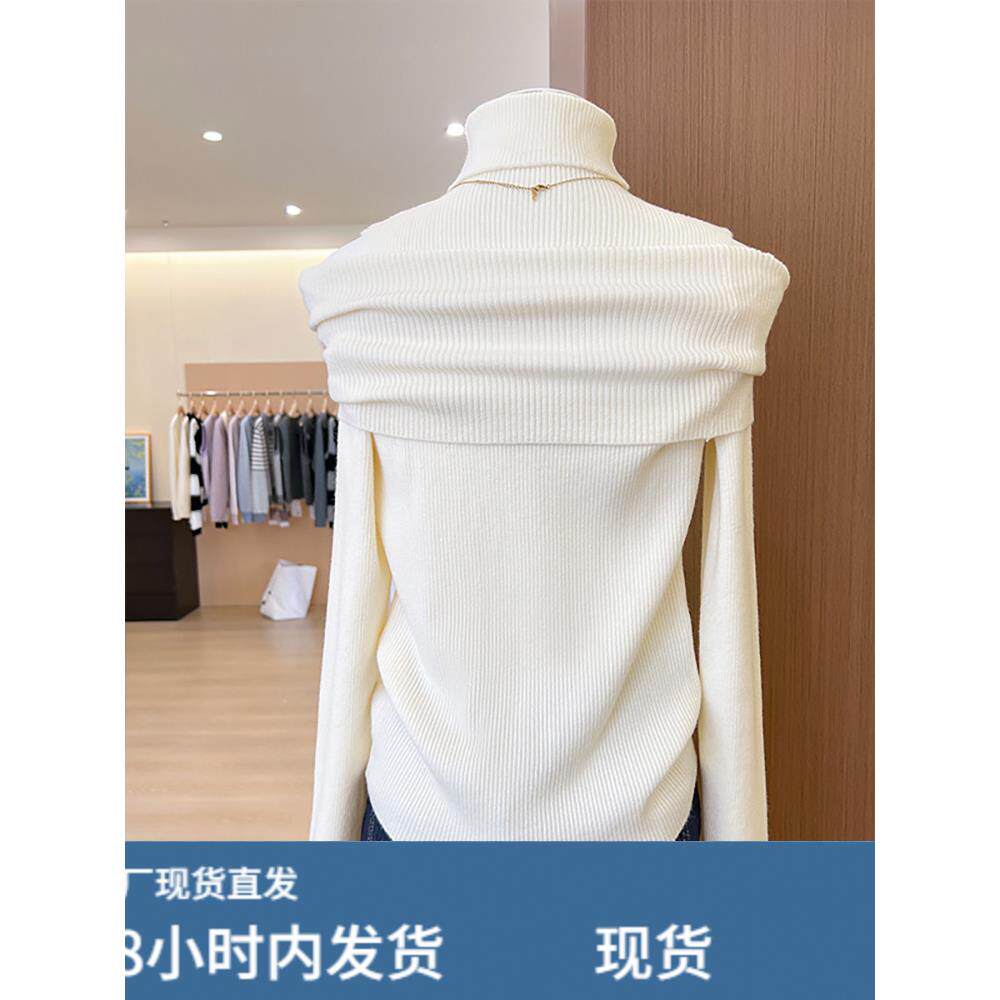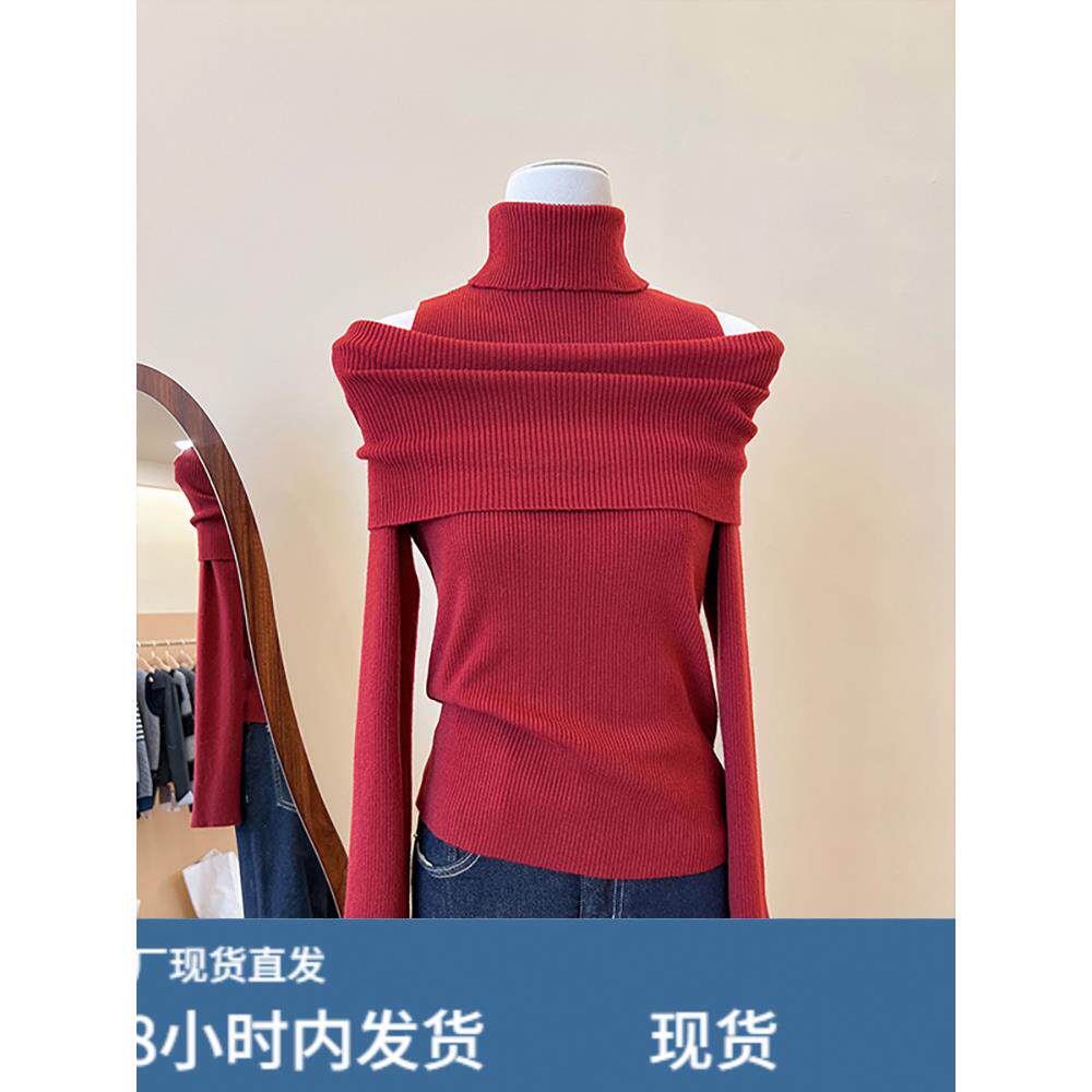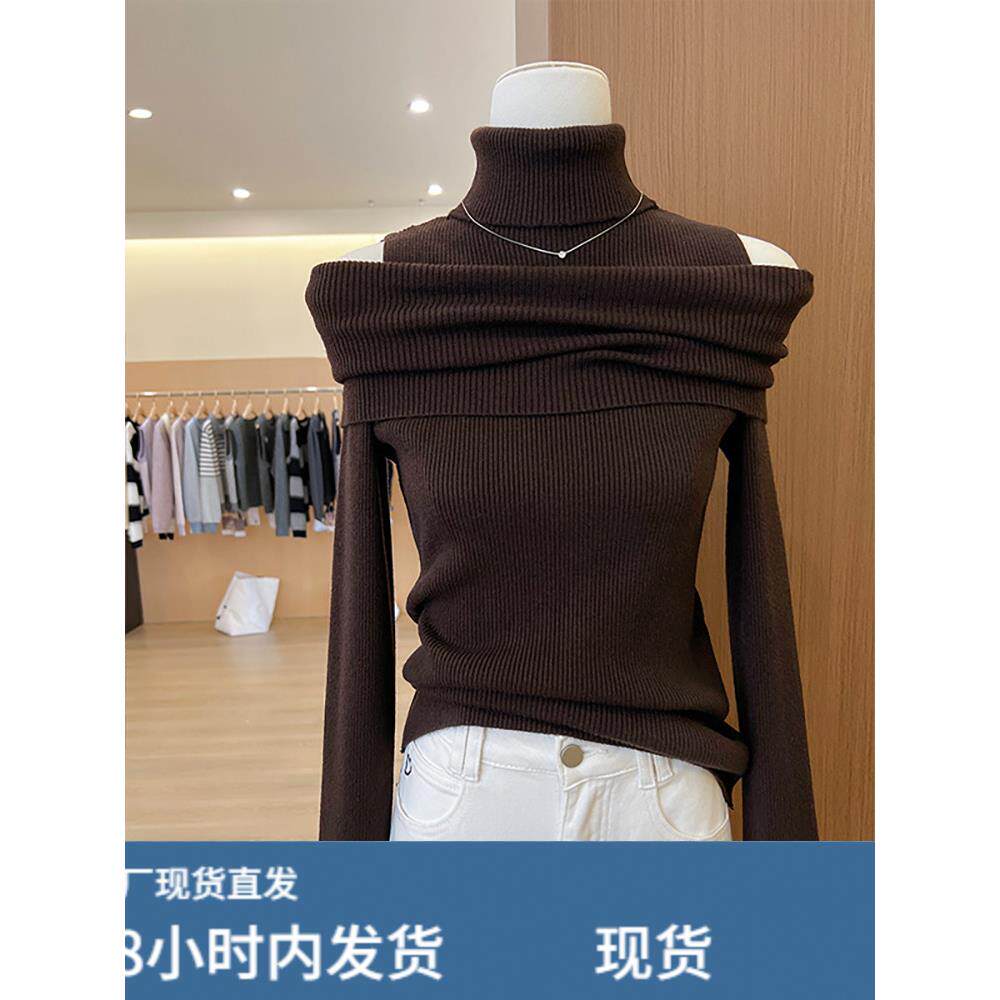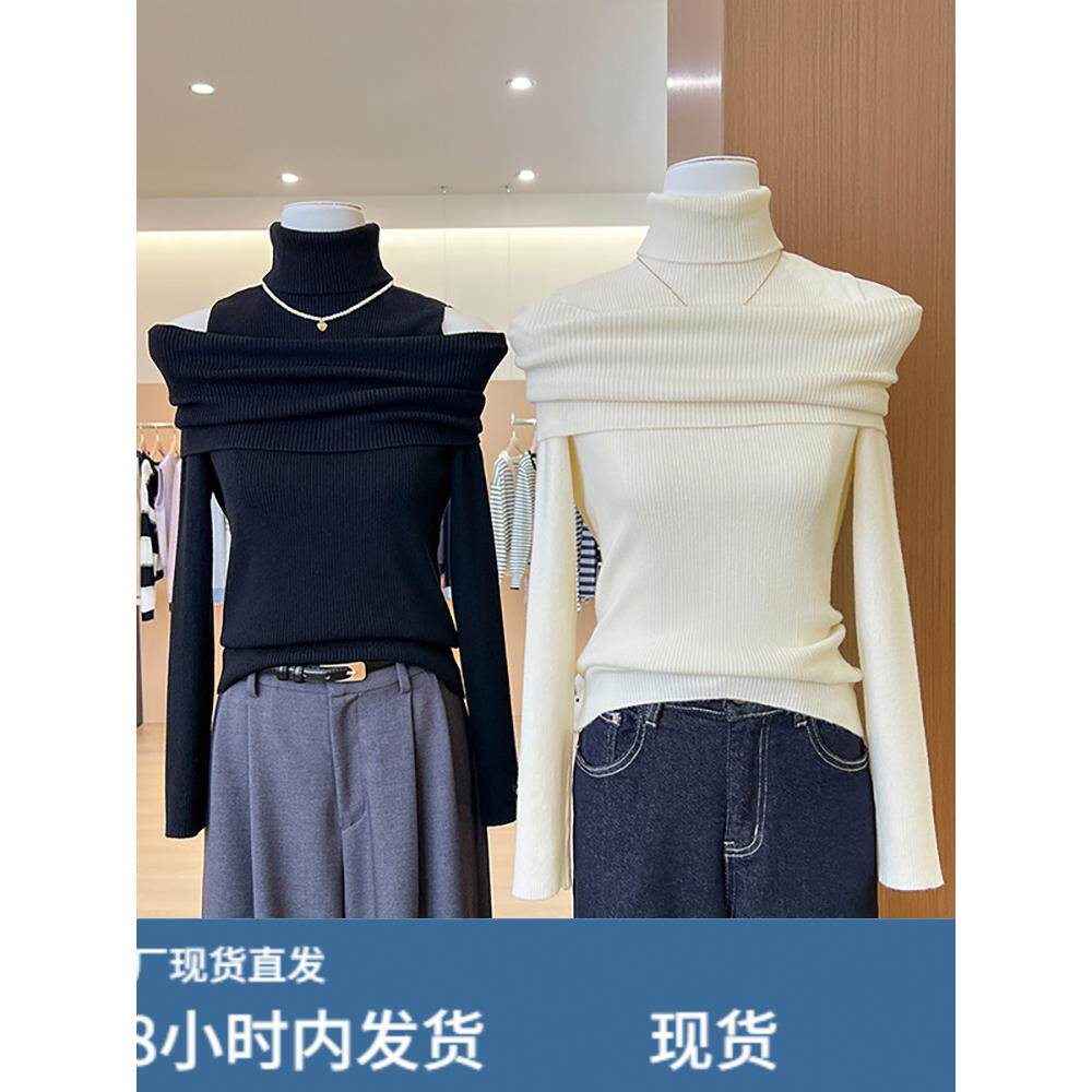 法式黑色高领绝美针织衫女款秋冬新款高级感打底毛衣内搭露肩上衣