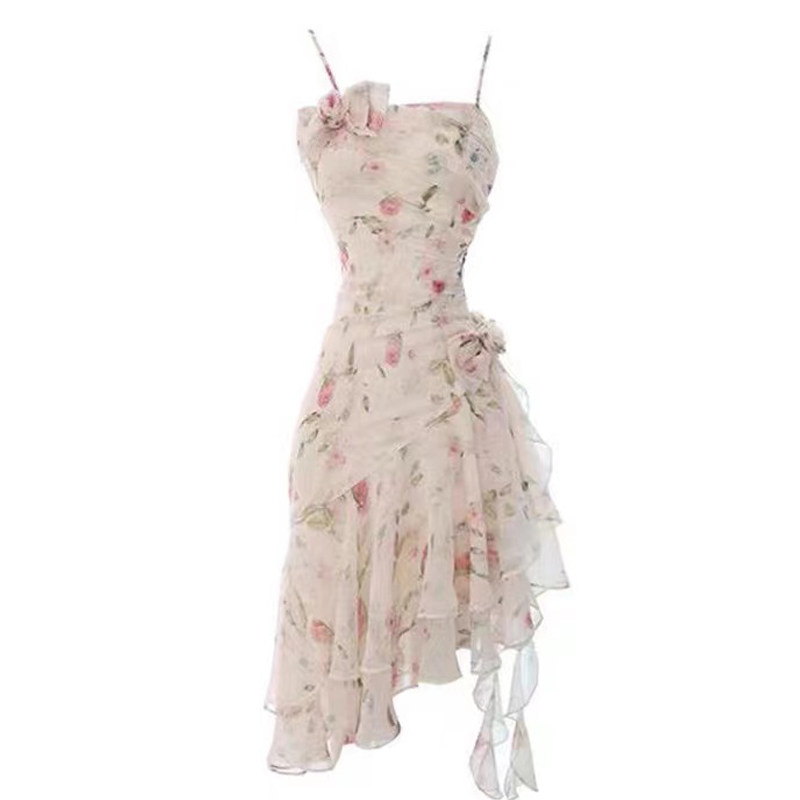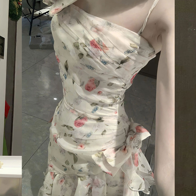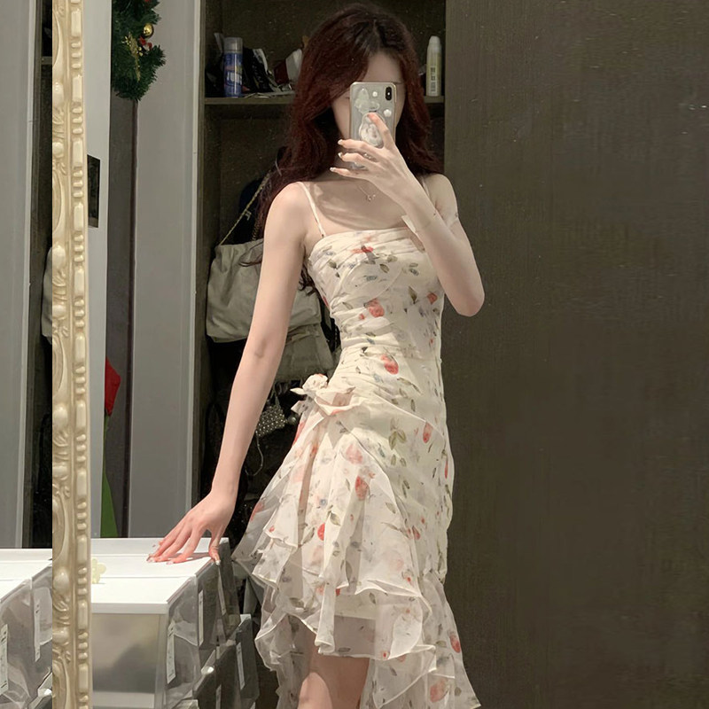 小众设计不规则白色碎花吊带春夏新款连衣裙收腰甜辣纯欲风长裙子