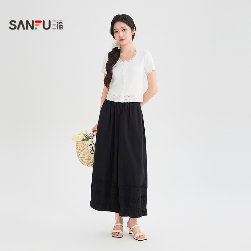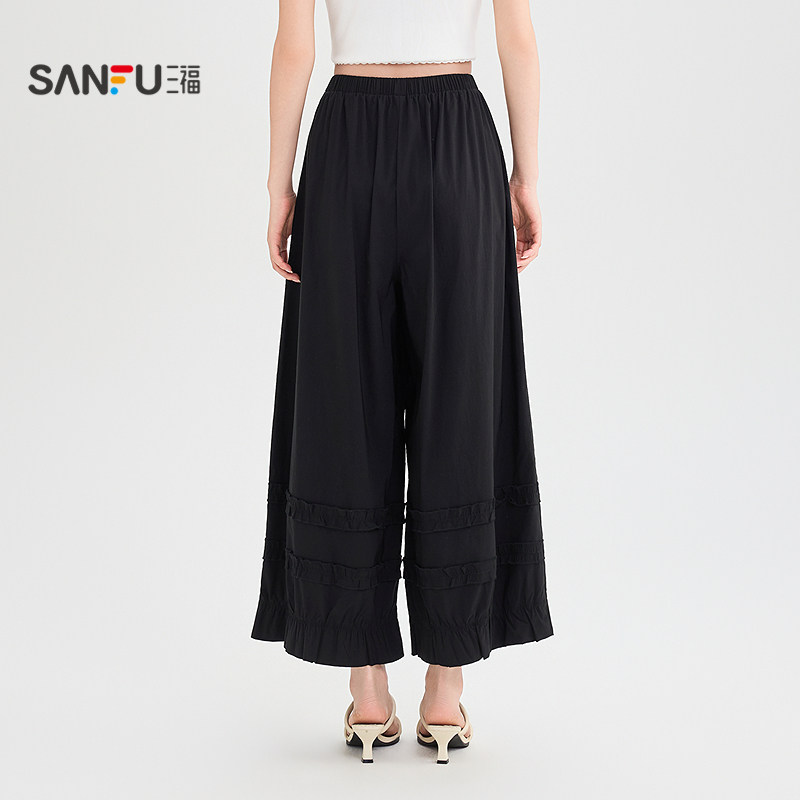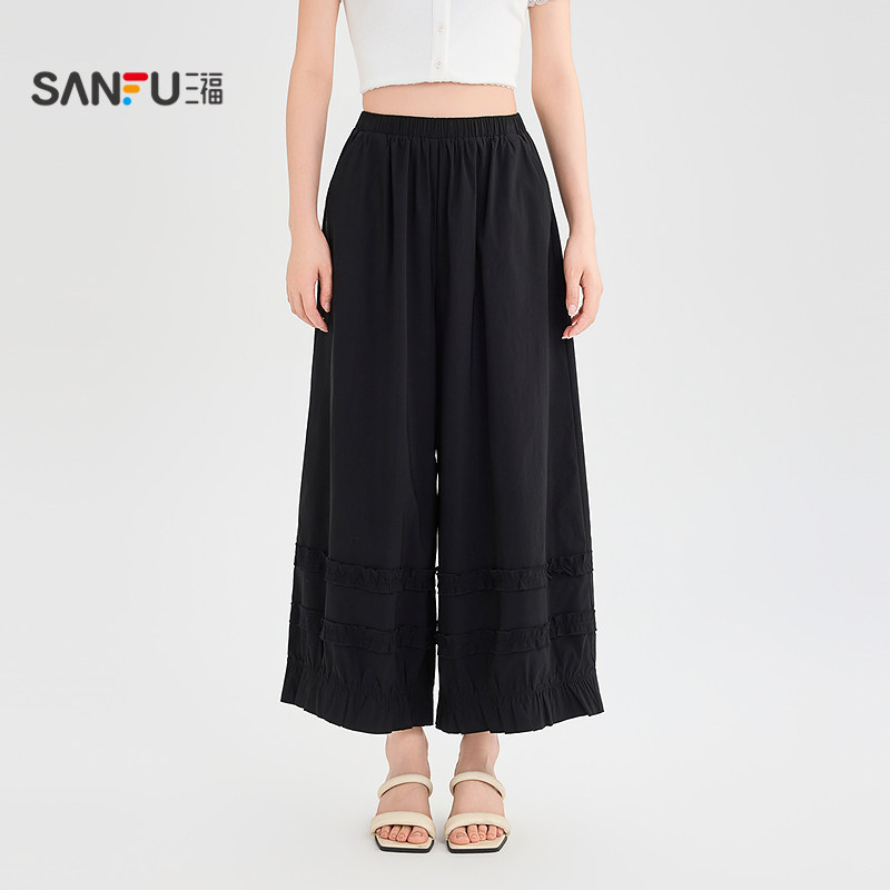 三福黑色休闲裤2026新款夏季木耳边灯笼裙裤宽松夏天垂感裤子女装