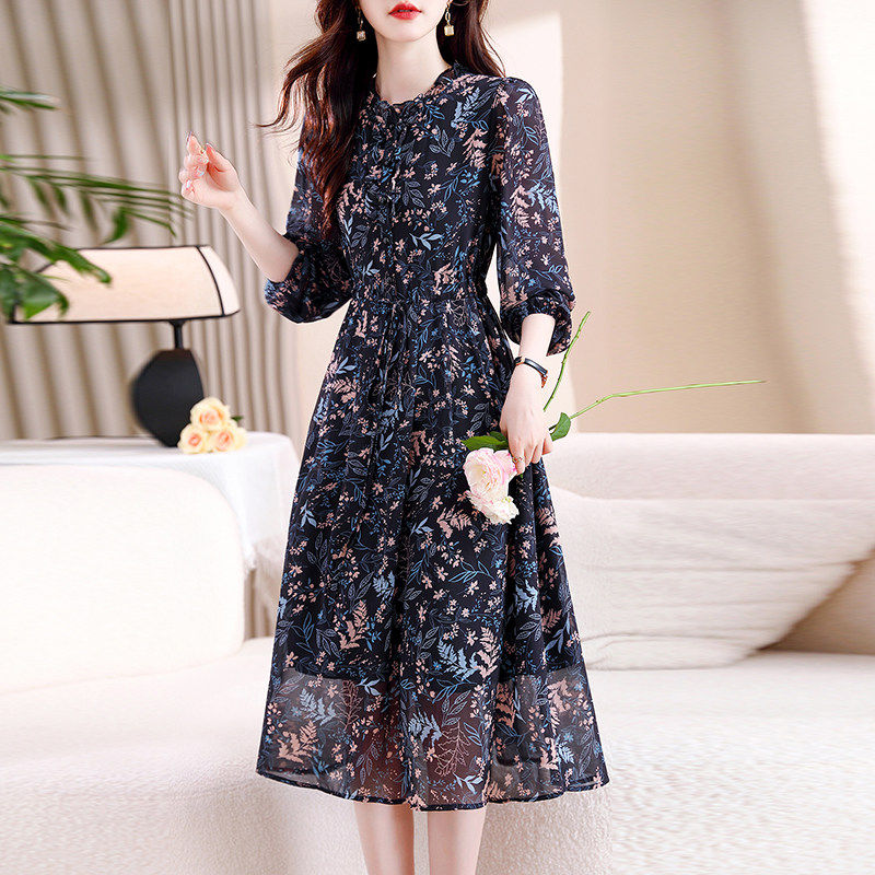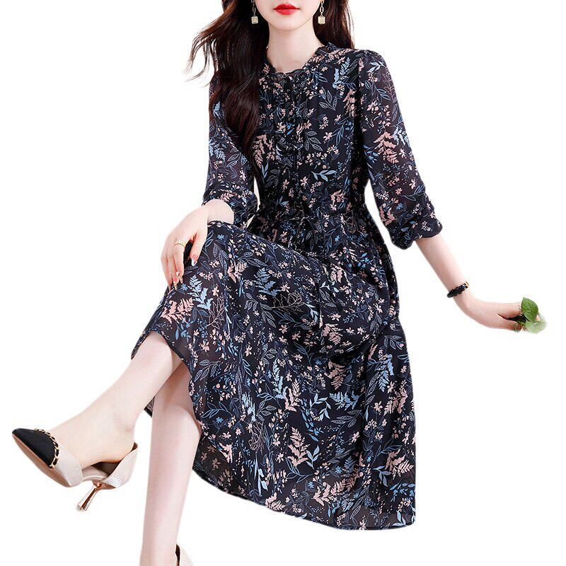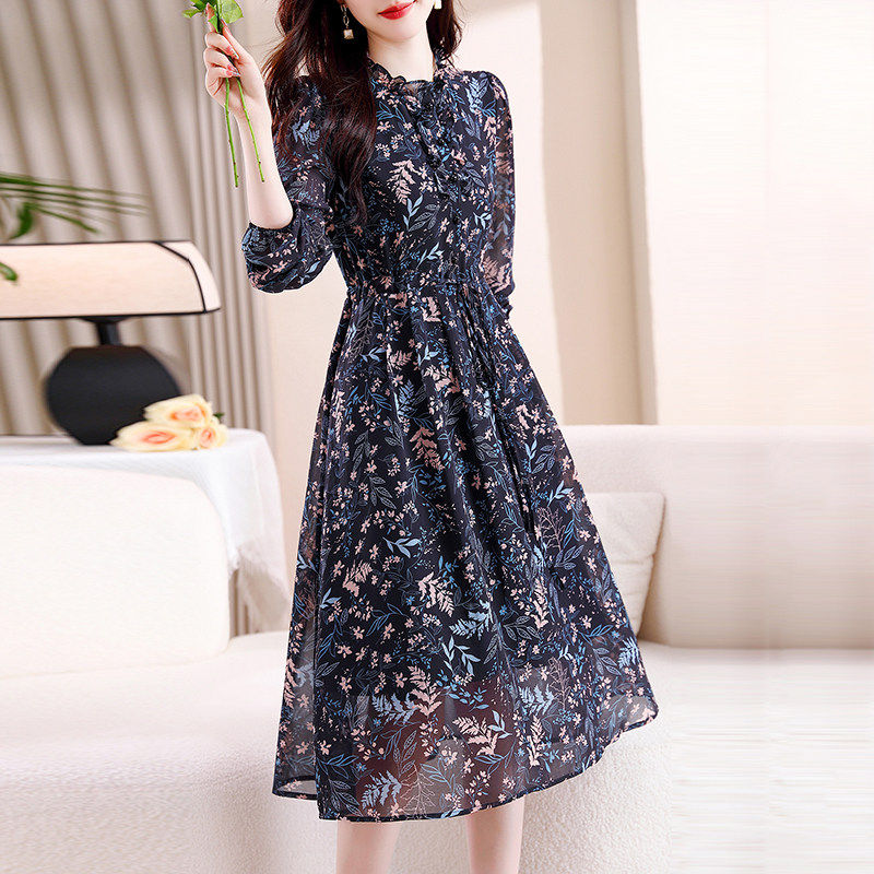 碎花雪纺连衣裙子女士装春秋冬季2026年新款小个子气质长袖中长裙
