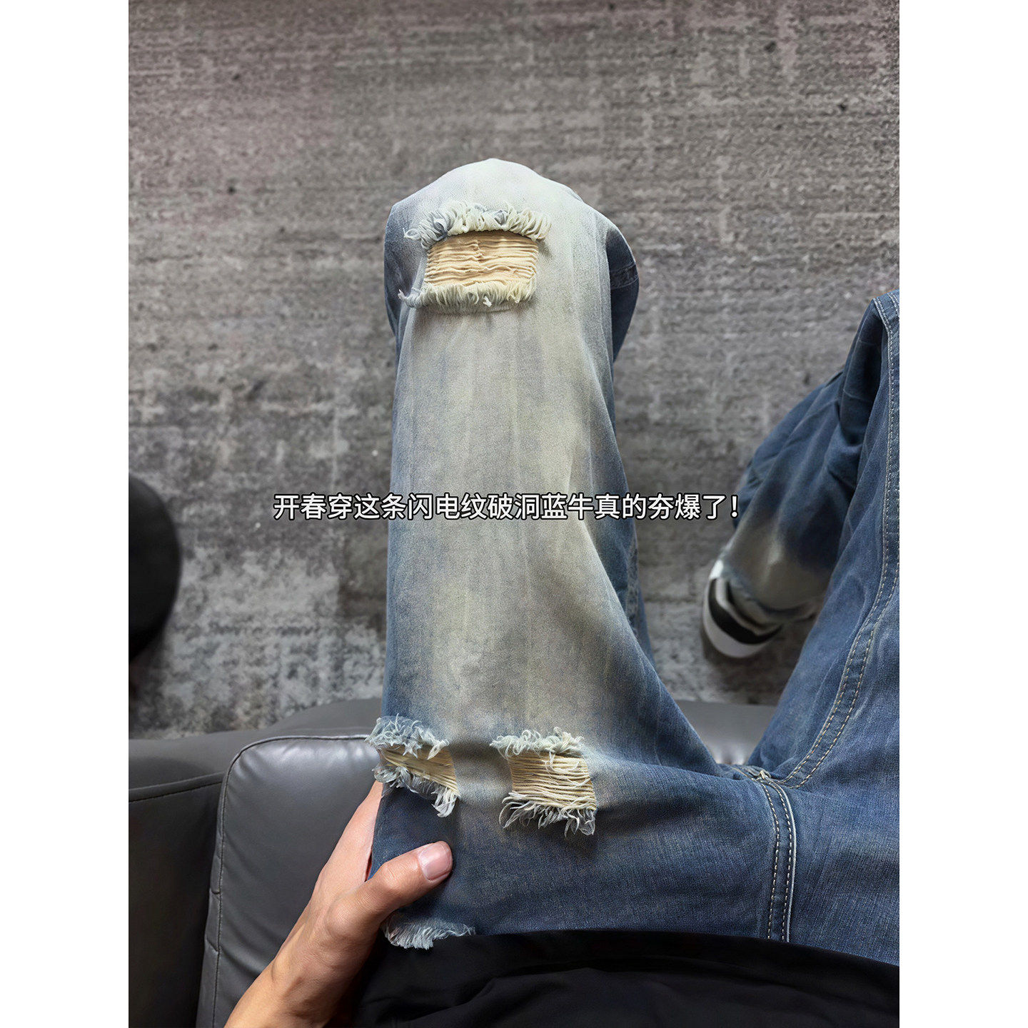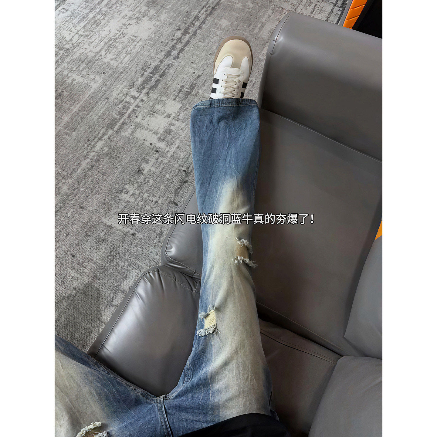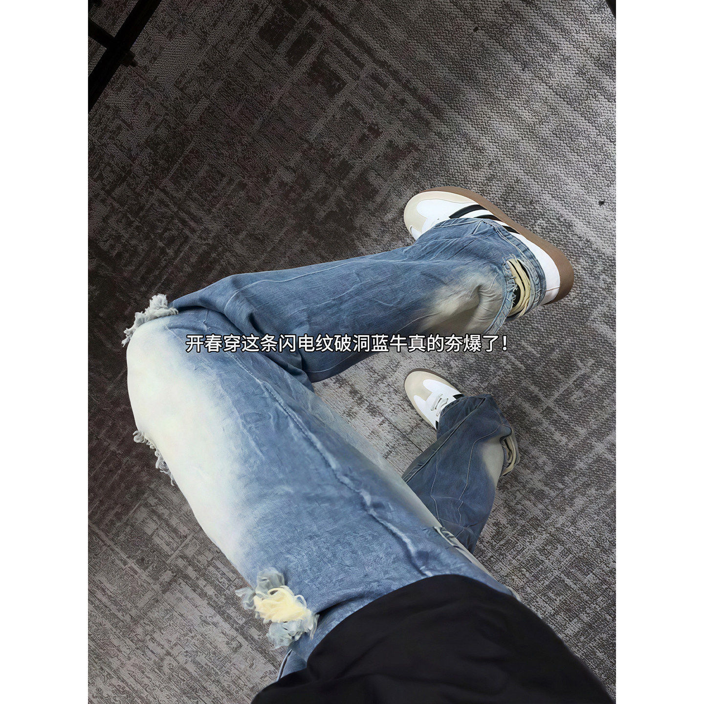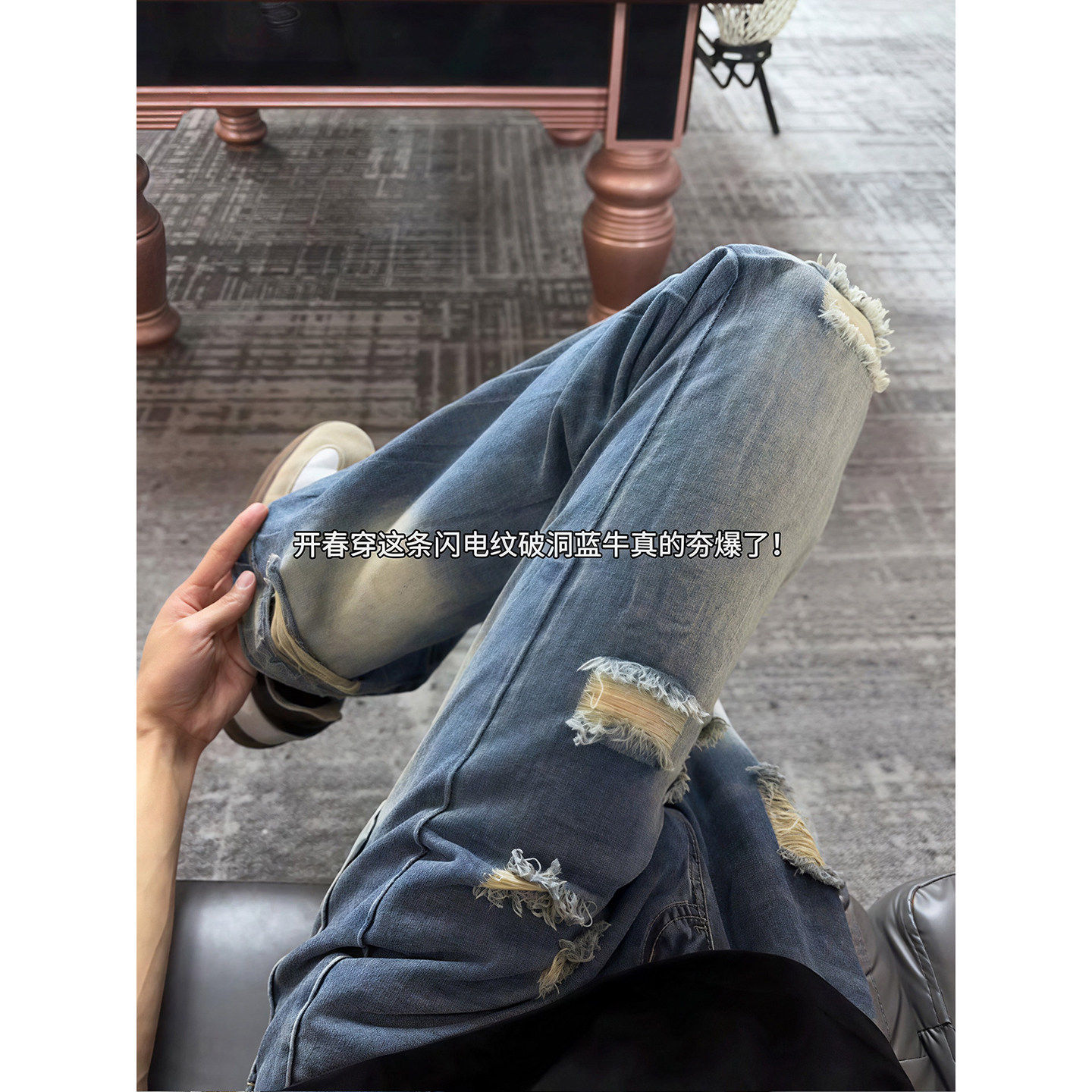 蓝色闪电纹破洞牛仔裤男款夏季显腿长直筒微喇裤美式高街vibe裤子