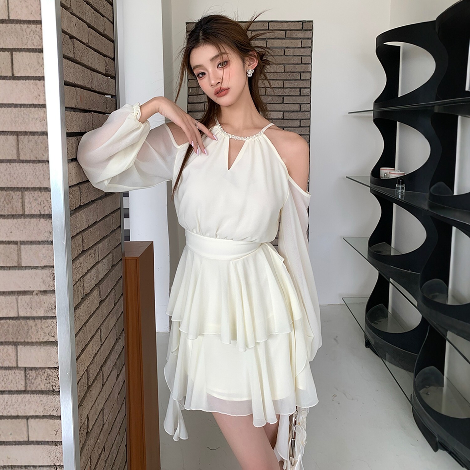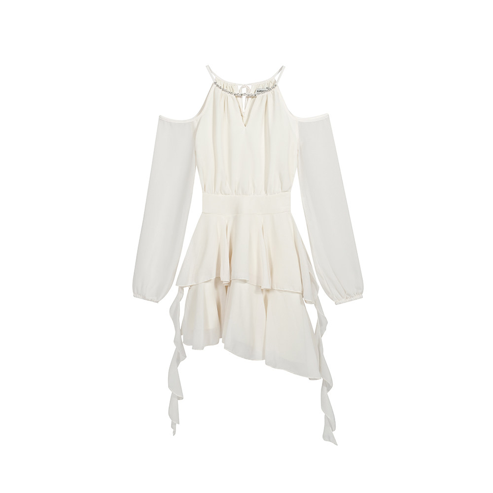 法式性感露肩荷叶边杏色雪纺挂脖连衣裙夏长袖收腰仙女蛋糕短裙子