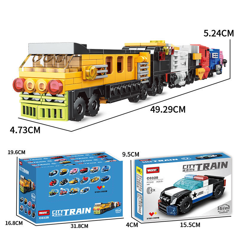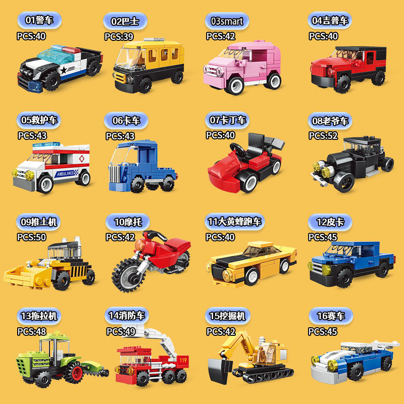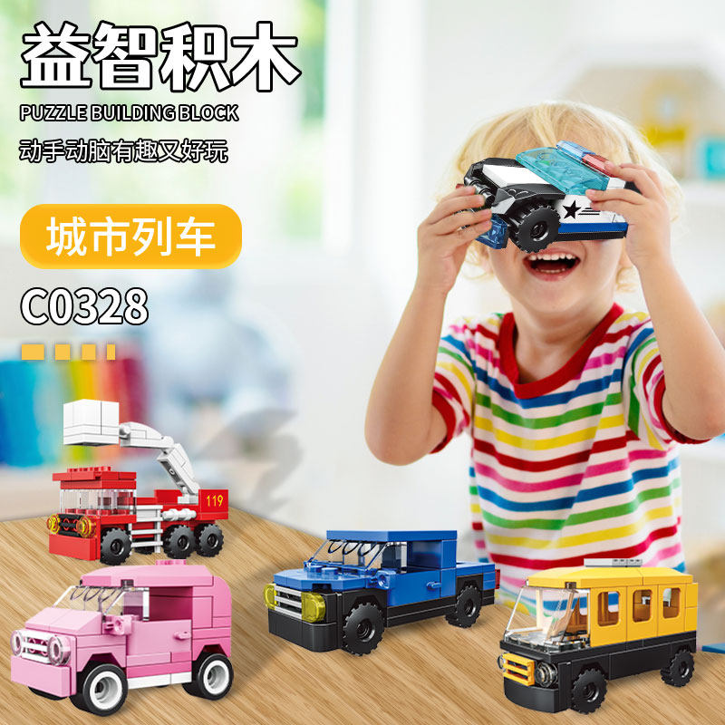 沃马积木城市列车消防车警车巴士益智小颗粒简易拼装汽车模型玩具