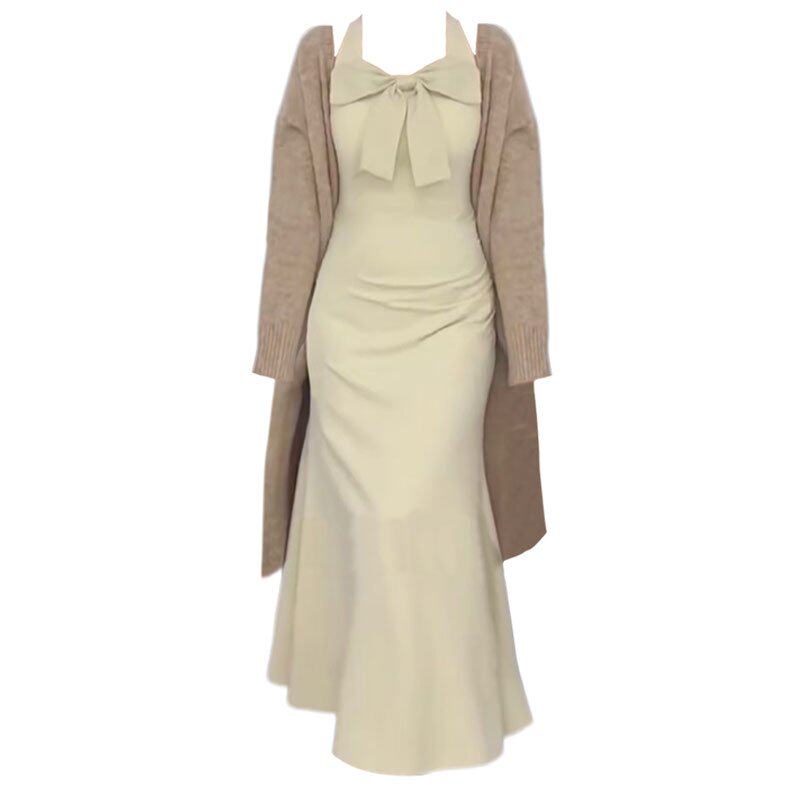 大码胖mm法式温柔风蝴蝶结挂脖连衣裙女春秋季针织开衫纯欲两件套