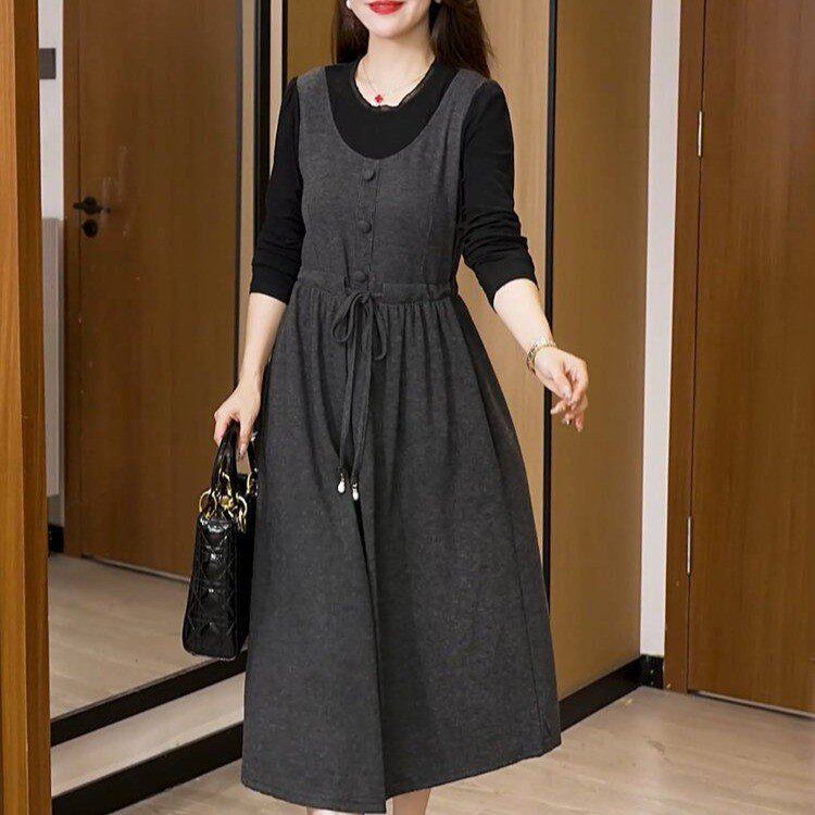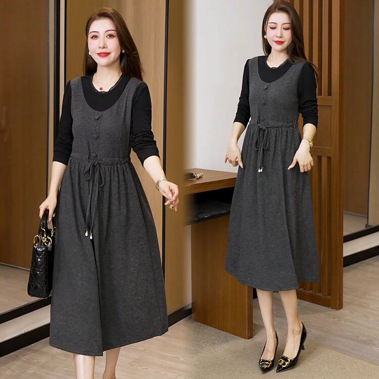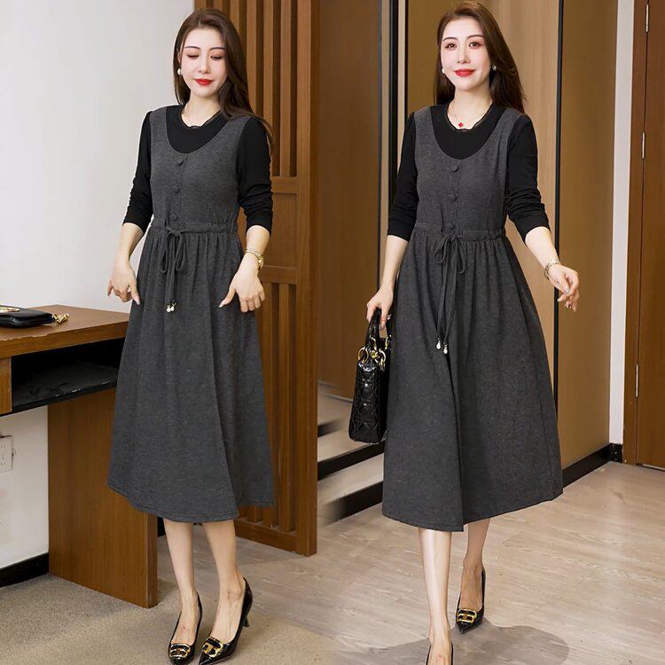 春秋新款长袖轻奢高级感收腰显瘦连衣裙妈妈装拼接假两件中长裙子