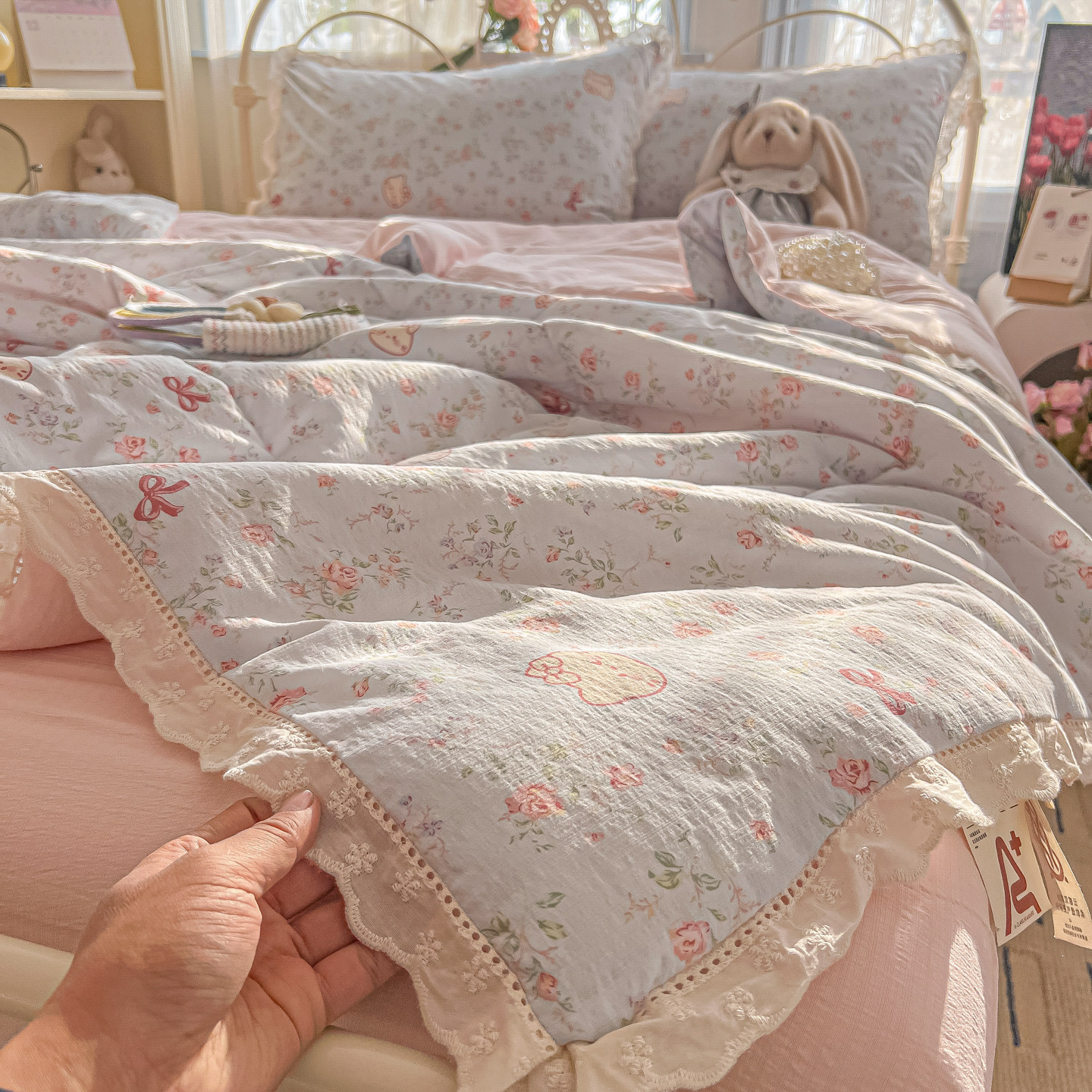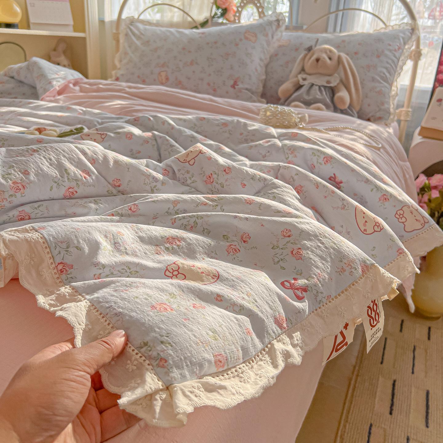 a类纯棉花边夏凉被全棉可机洗空调被四件套双人春秋单人夏薄被子