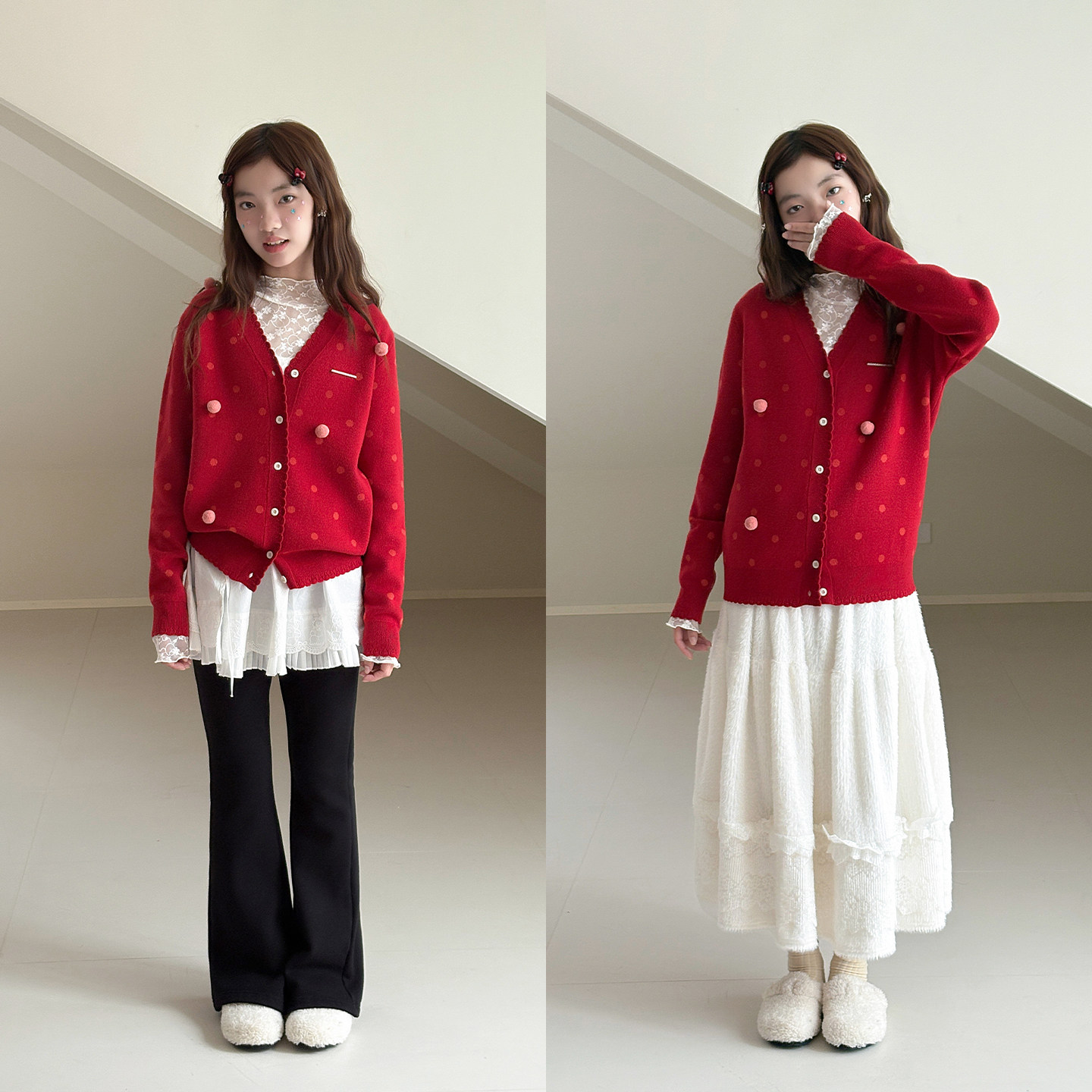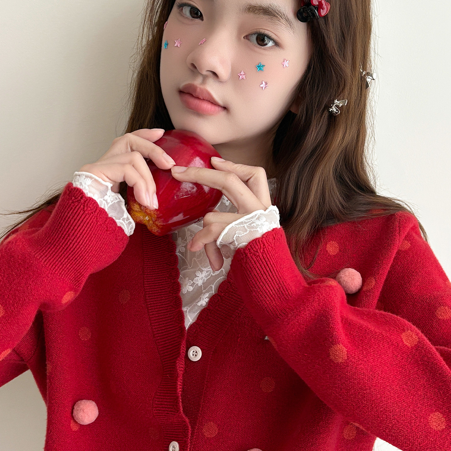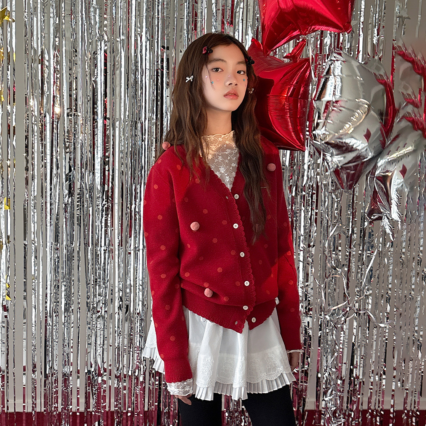 女大童毛衣【复古法式】青少年春秋新款新年红色毛球针织开衫外套