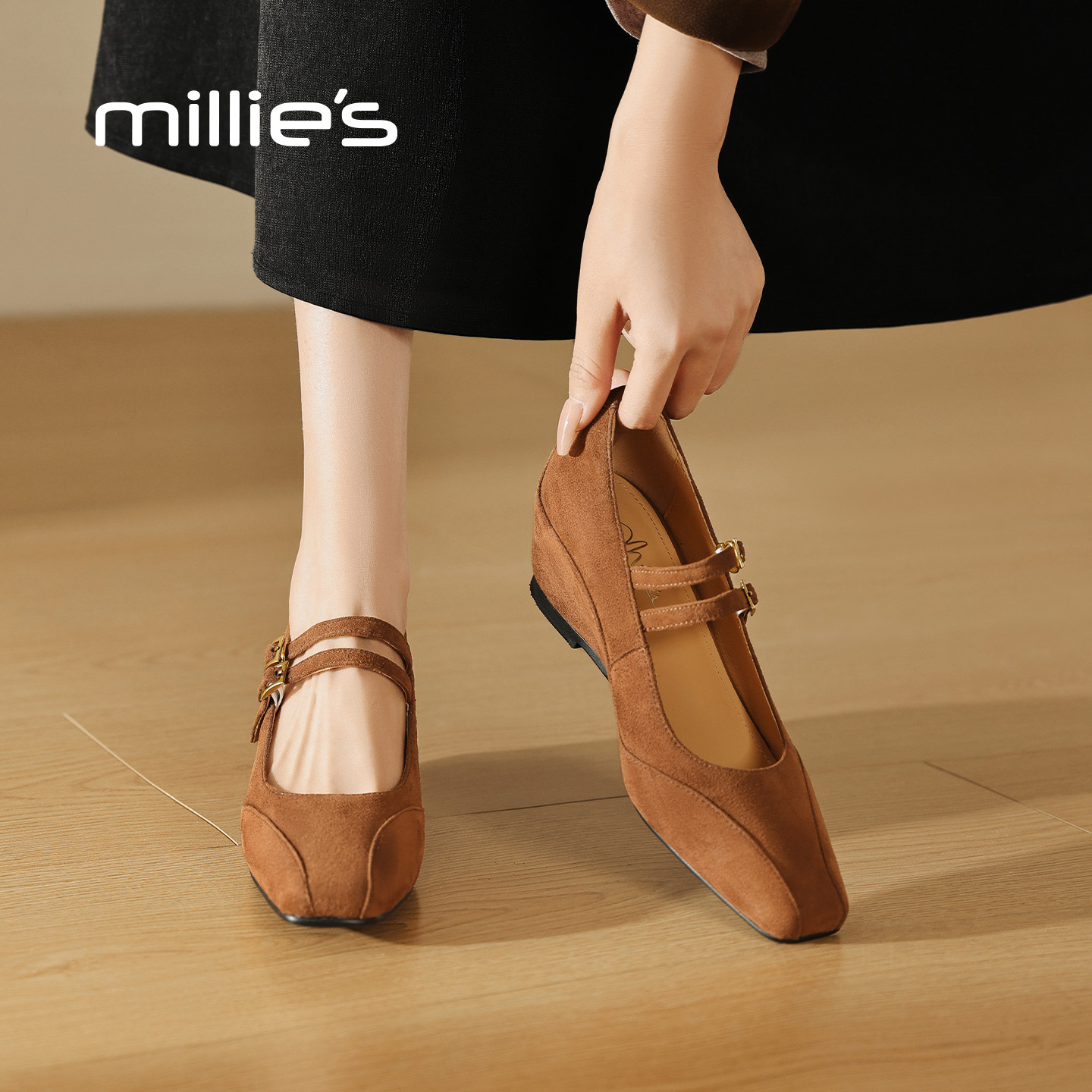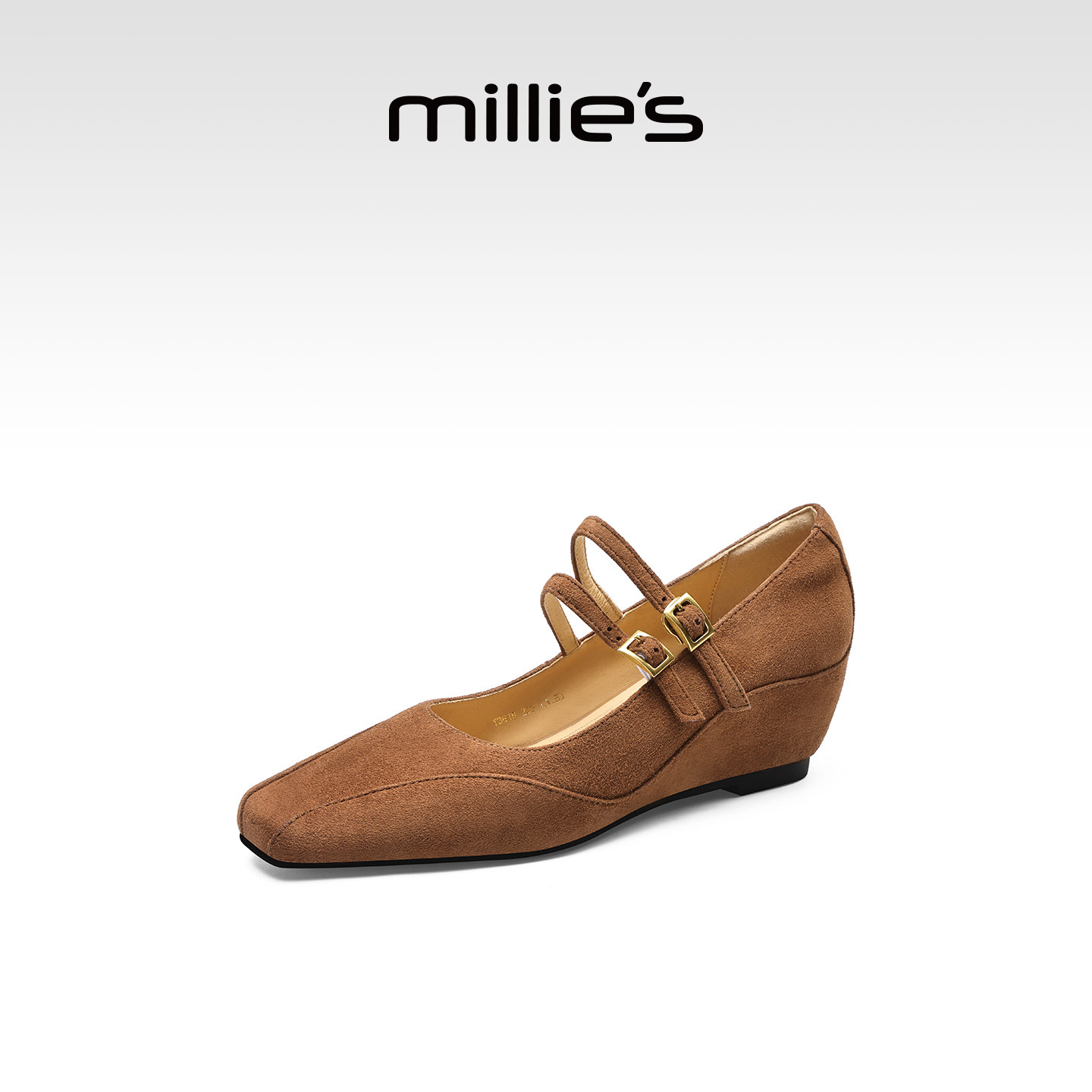 MILLIE'S/妙丽真皮复古坡跟内增高浅口单鞋2026春款方头玛丽珍鞋