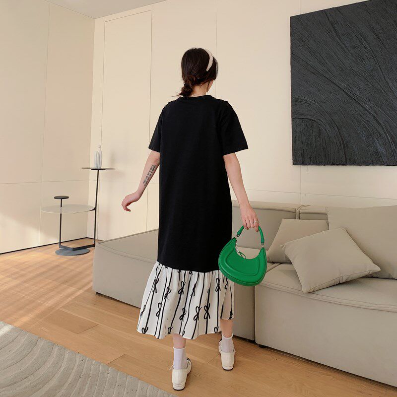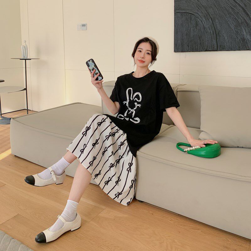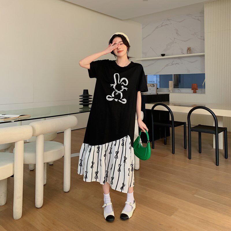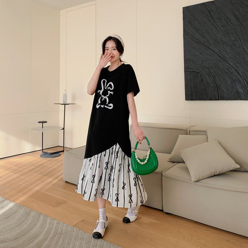 超大码孕妇连衣裙夏季时尚拼接印花ya字大摆裙假两件宽松200-300