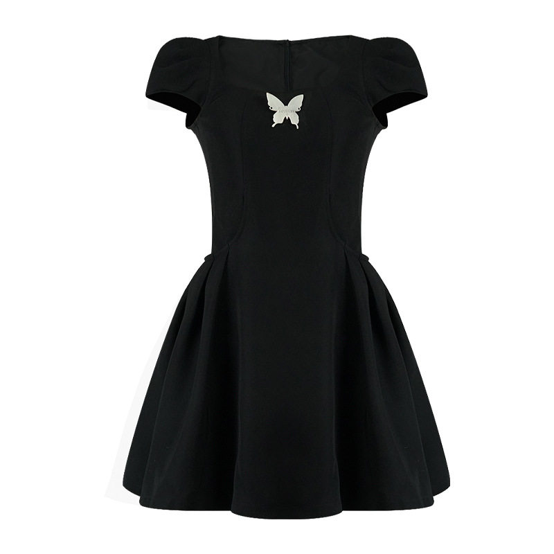 法式方领黑色连衣裙女收腰气质设计感短款a字小黑裙子夏季