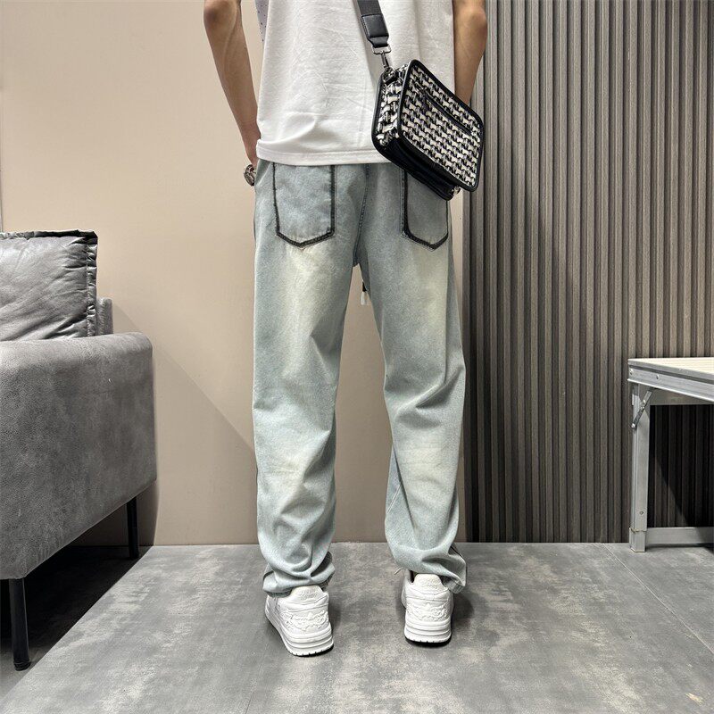 2026春夏新款美式复古阔腿裤宽松直筒长裤子浅蓝色时尚牛仔裤男士
