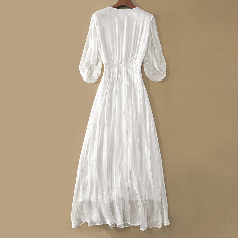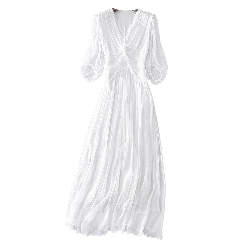 真丝连衣裙小众设计感飘逸垂坠度假裙仙气高级感桑蚕丝白色长裙夏