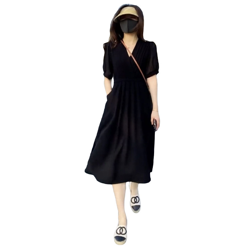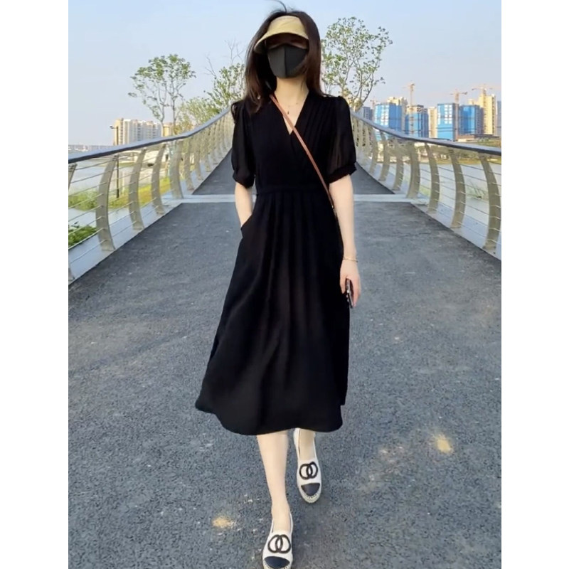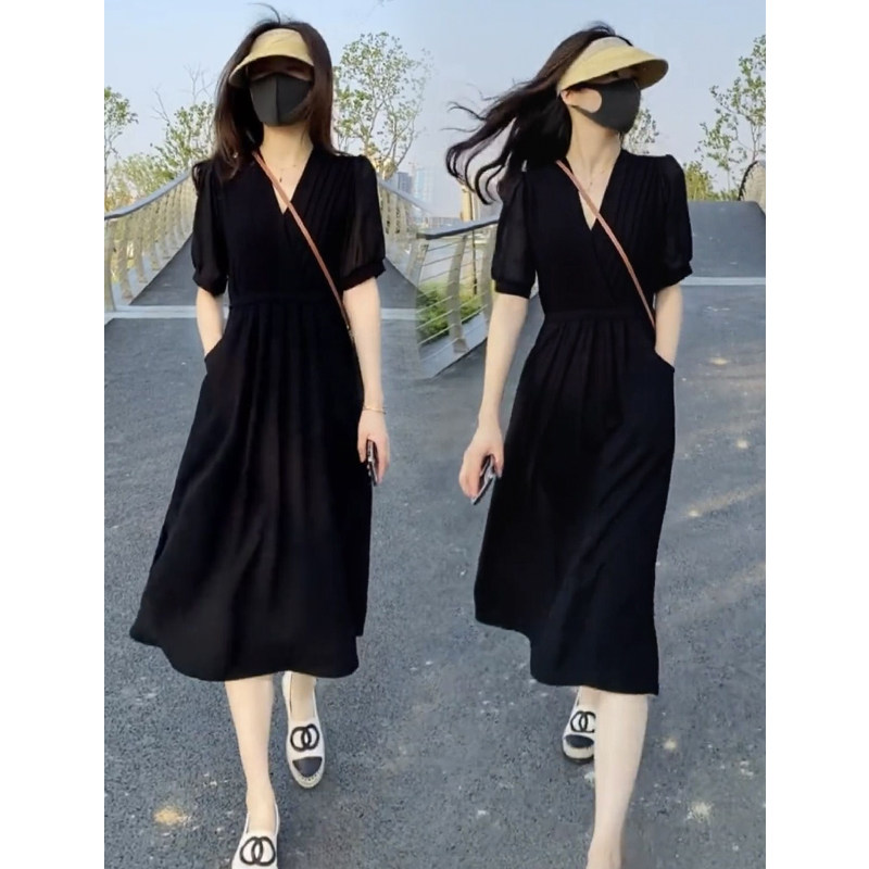 黑色连衣裙女夏季新款赫本风法式zV领高级感气质收腰显瘦a字长裙
