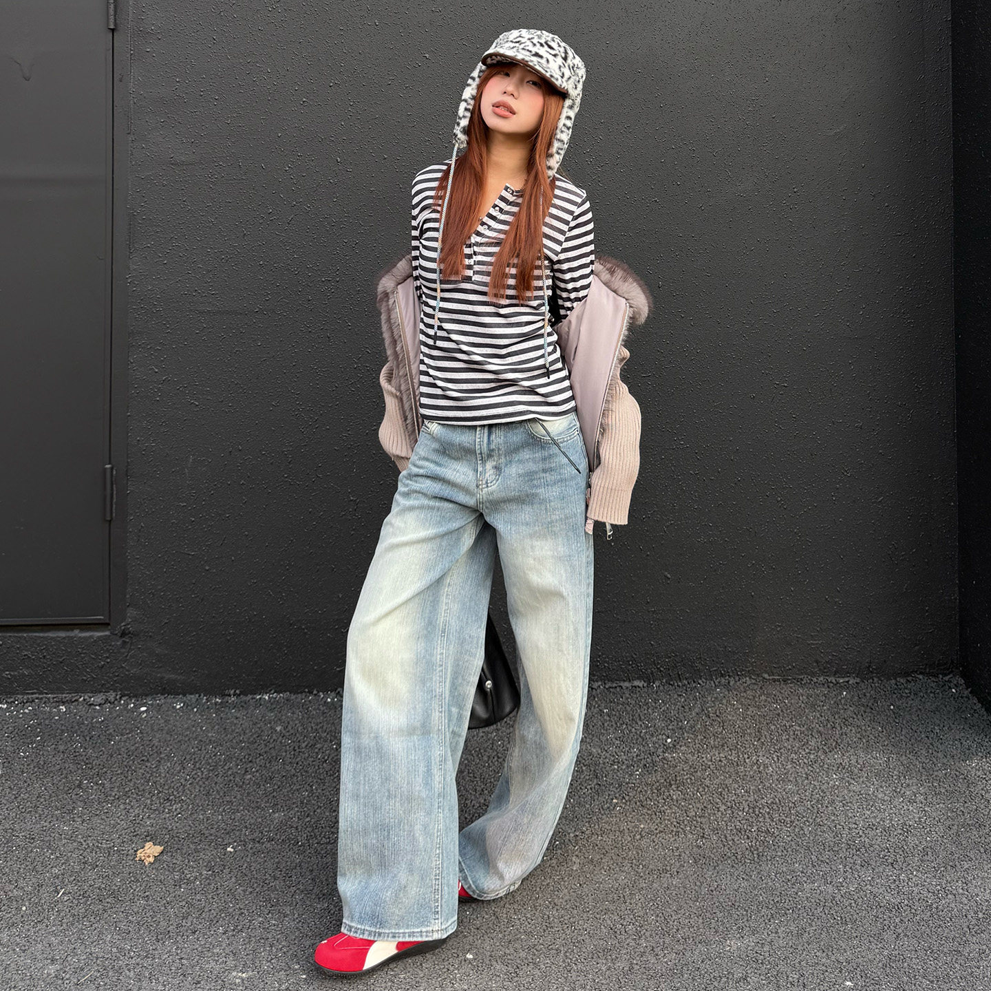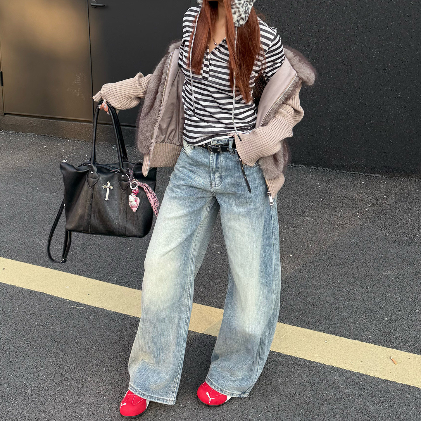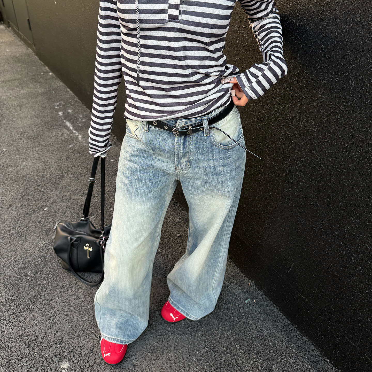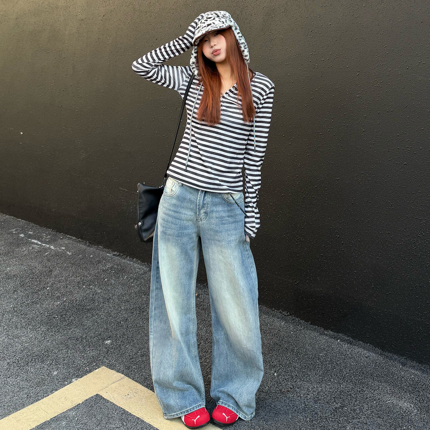 美式复古竹节纹阔腿牛仔裤女春季新款浅色直筒宽松显瘦拖地弯刀裤