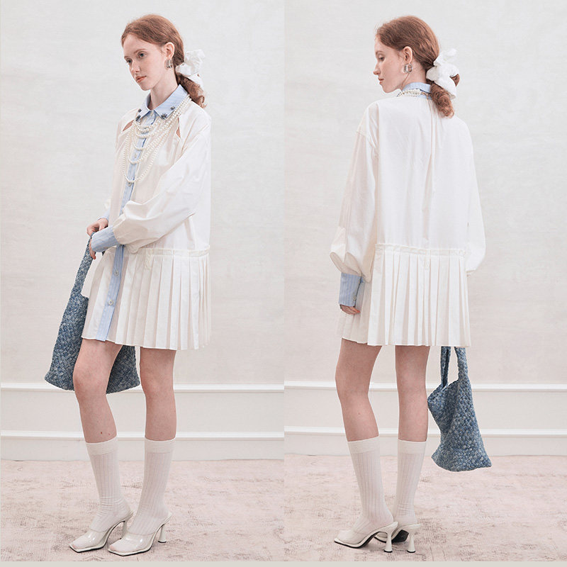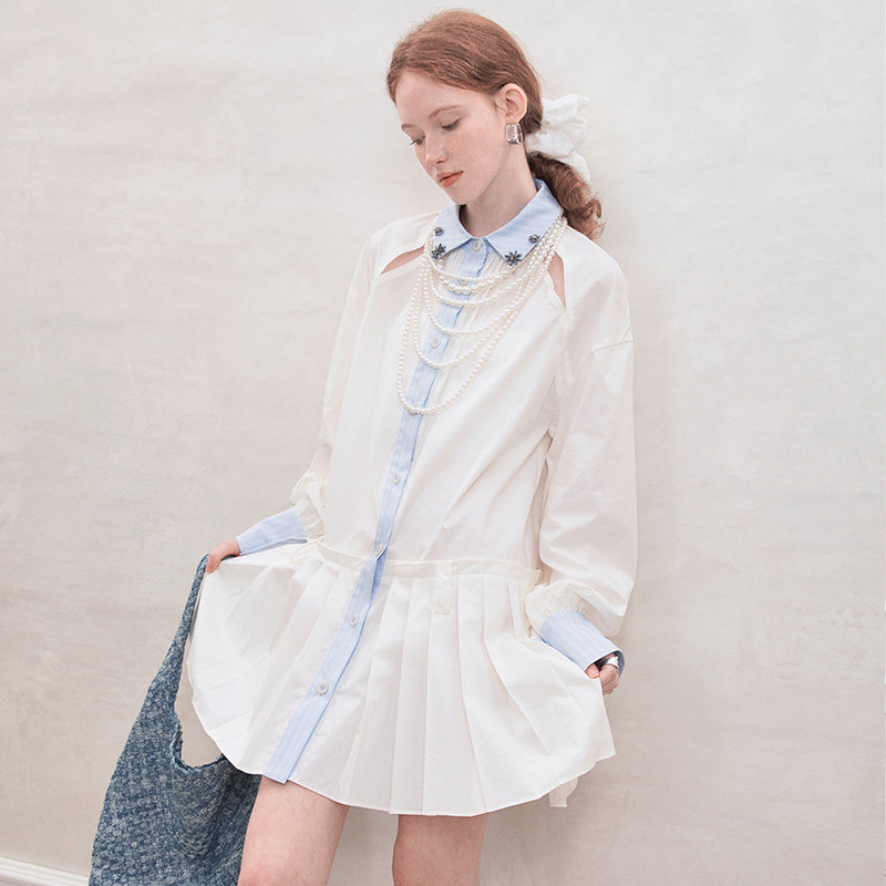 创世纪元【白貌春日】法式白色长袖连衣裙女夏季短款百褶衬衫裙子