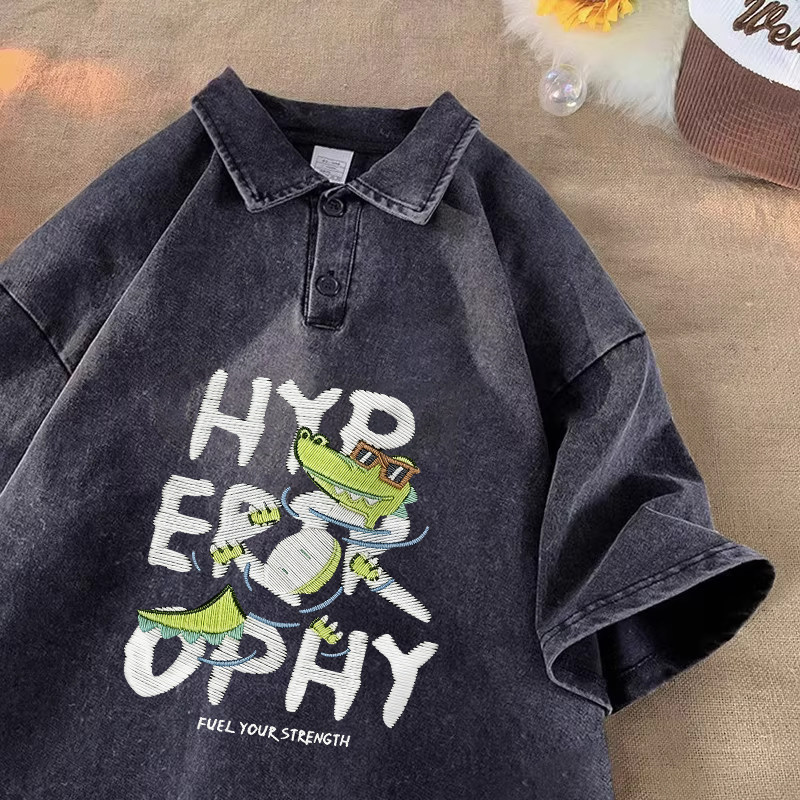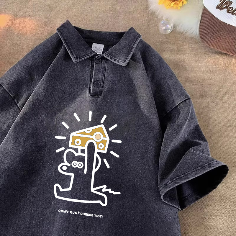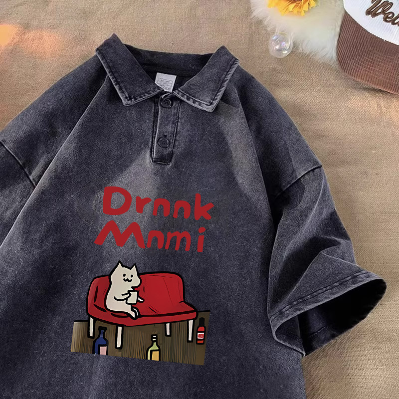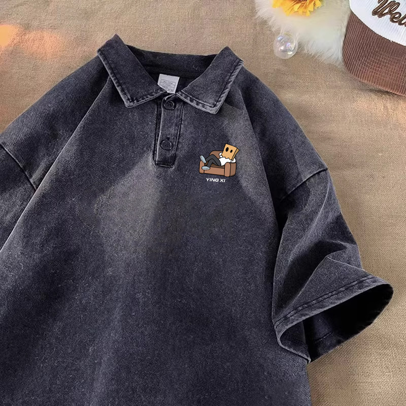 重磅水洗做旧短袖polo衫男士夏季宽松青少年痞帅衬衫领五分袖t恤