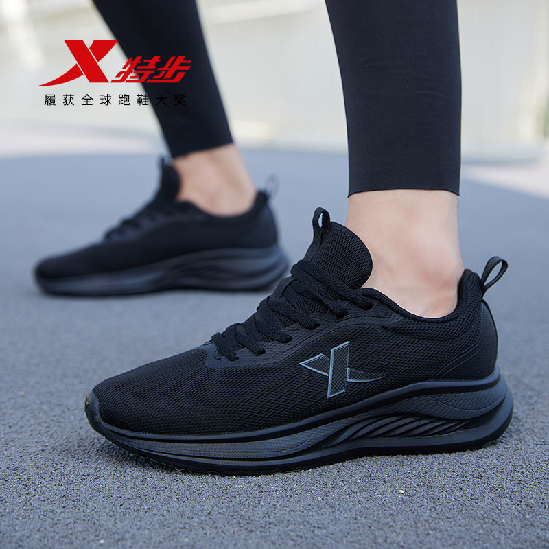 特步男鞋青少年运动鞋官方旗舰店正品冬透气网面薄款纯黑色跑步鞋