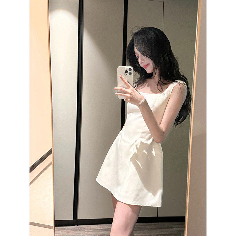 白色吊带连衣裙女短款高级感修身初恋miu系千金风收腰a字裙子掐腰