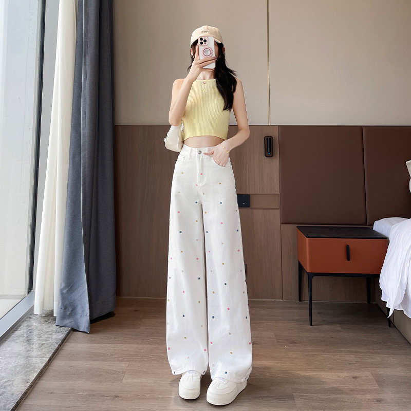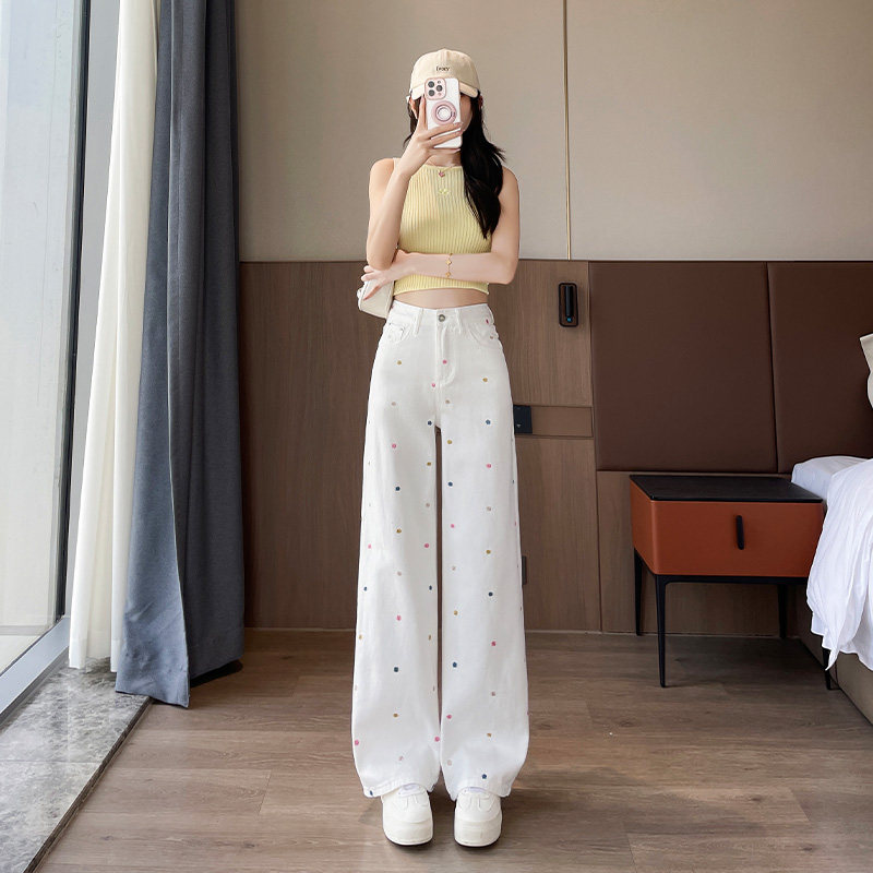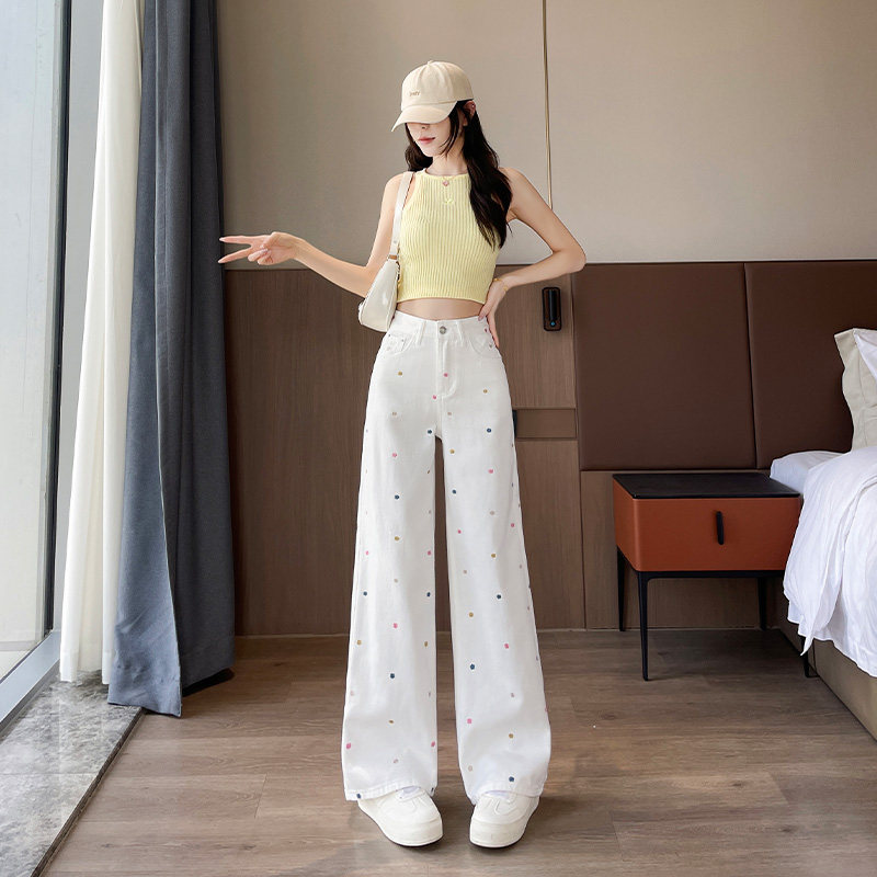 小花刺绣白色窄版直筒牛仔裤女2026年秋季新款高腰显瘦小个子阔腿