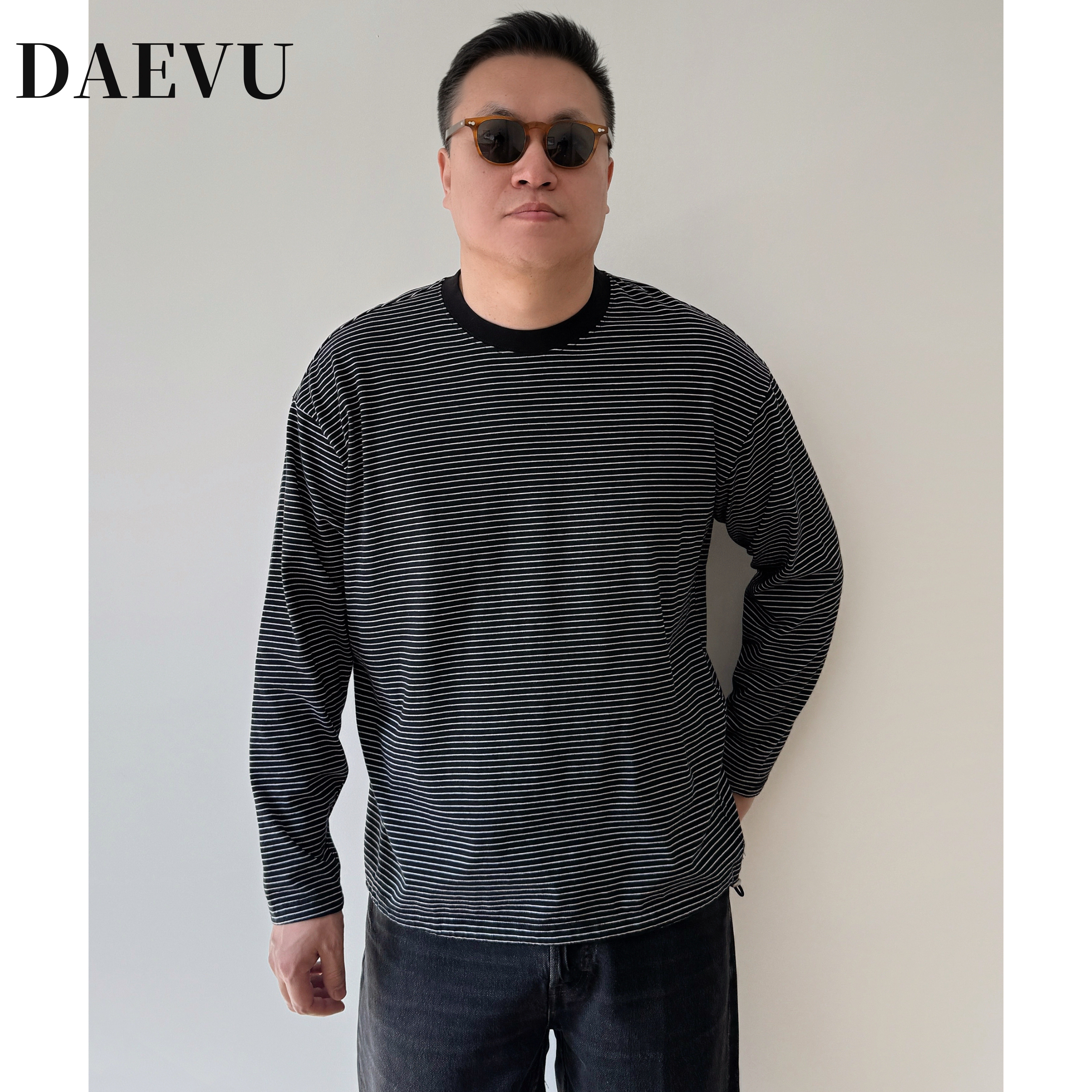 大依无忧大码男装春新款细条纹长袖t恤胖子加肥加大男款打底衫