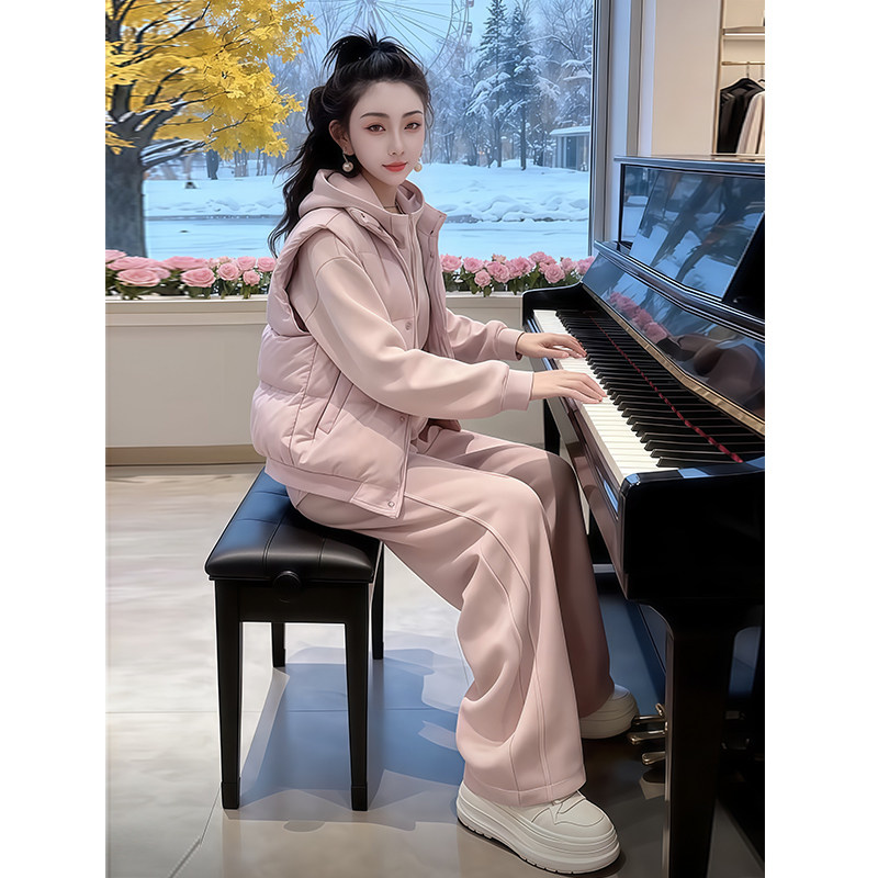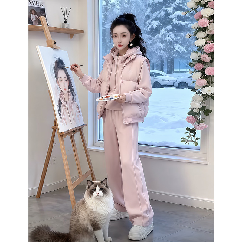 羽绒棉马甲三件套女2026新款冬季休闲运动小个子加绒加厚卫衣套装