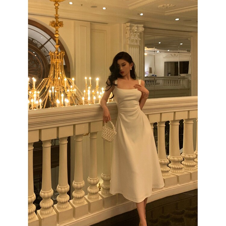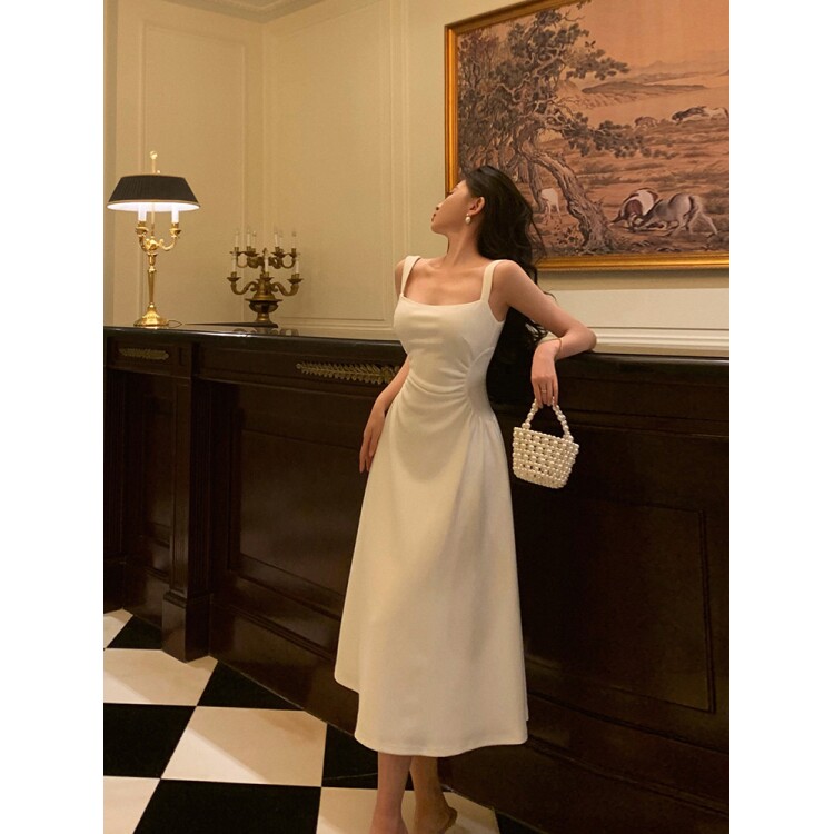 法式白色吊带连衣裙女2025新款收腰裙子高级感领证礼服长裙小个子