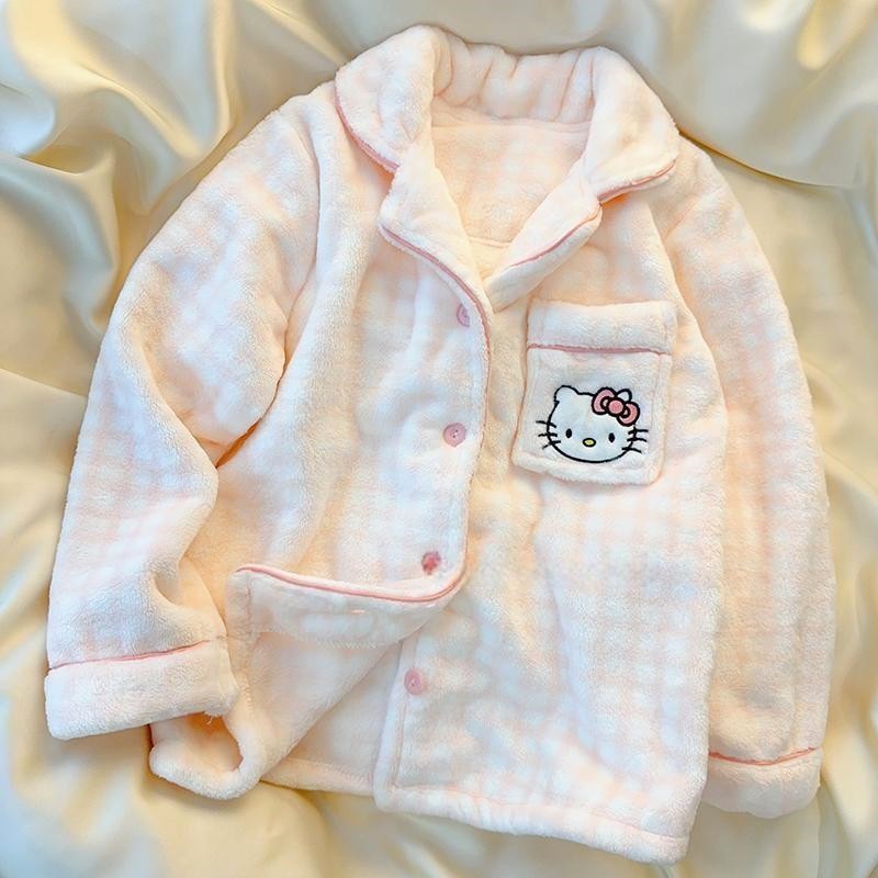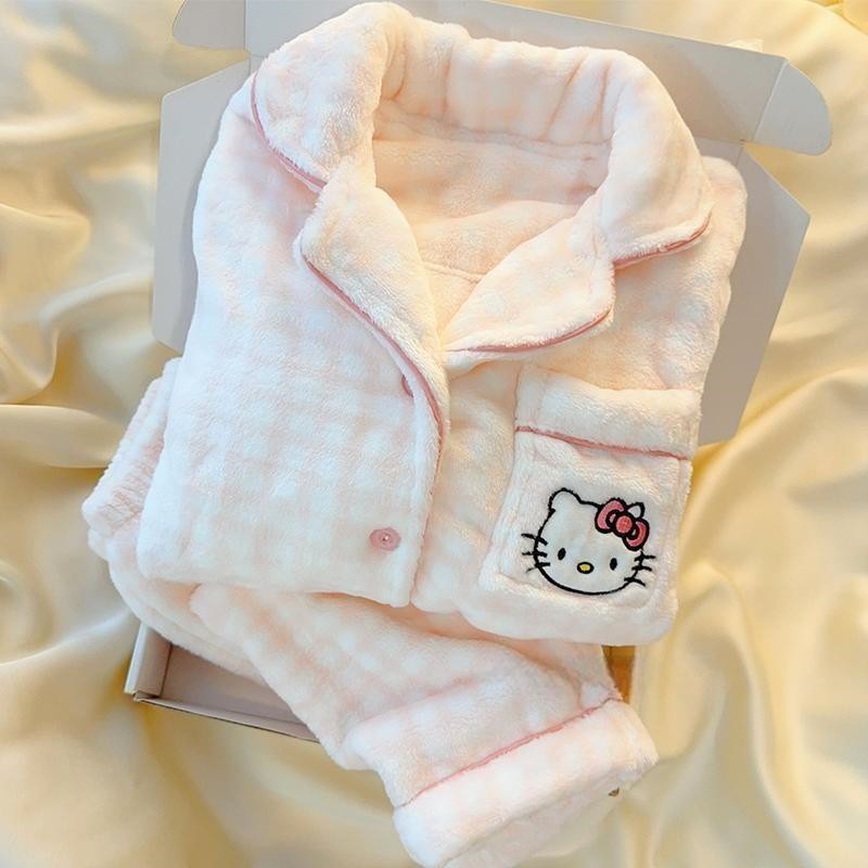 女童睡衣法兰绒加厚保暖卡通KT猫中大童冬季女孩珊瑚绒儿童家居服