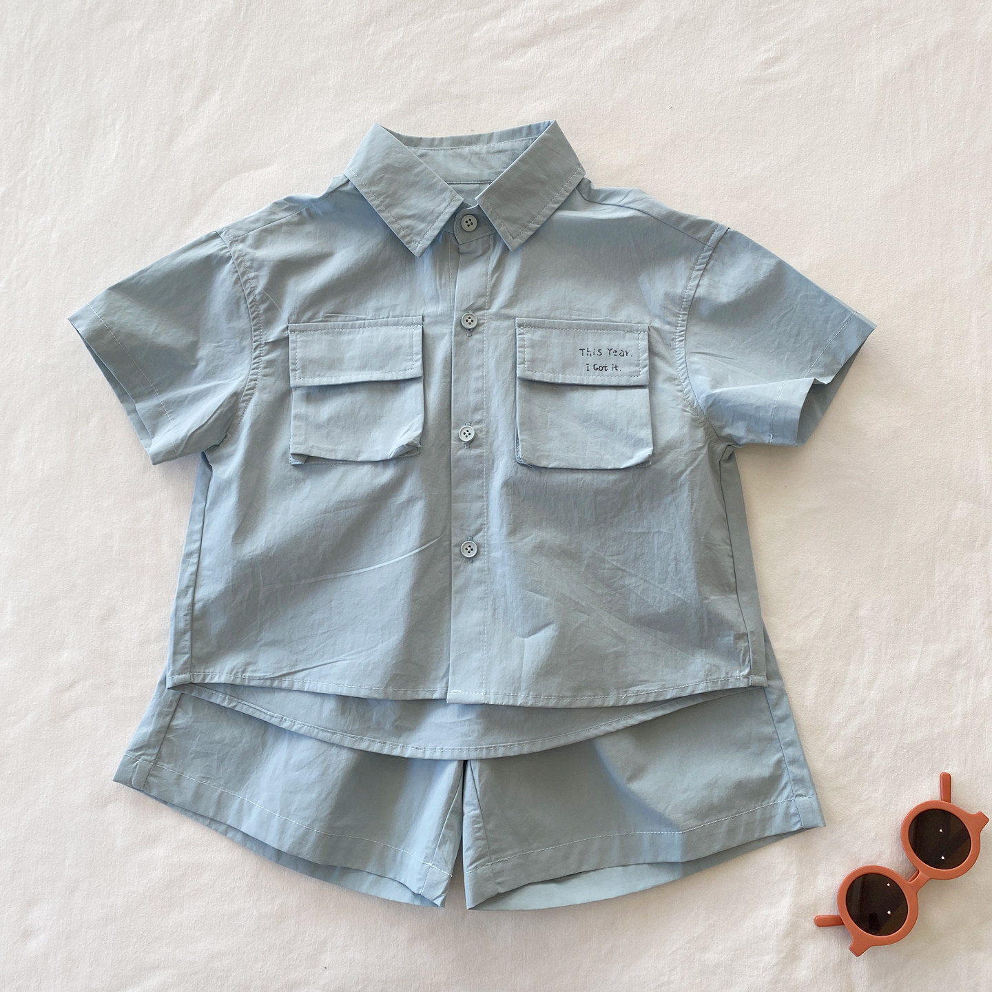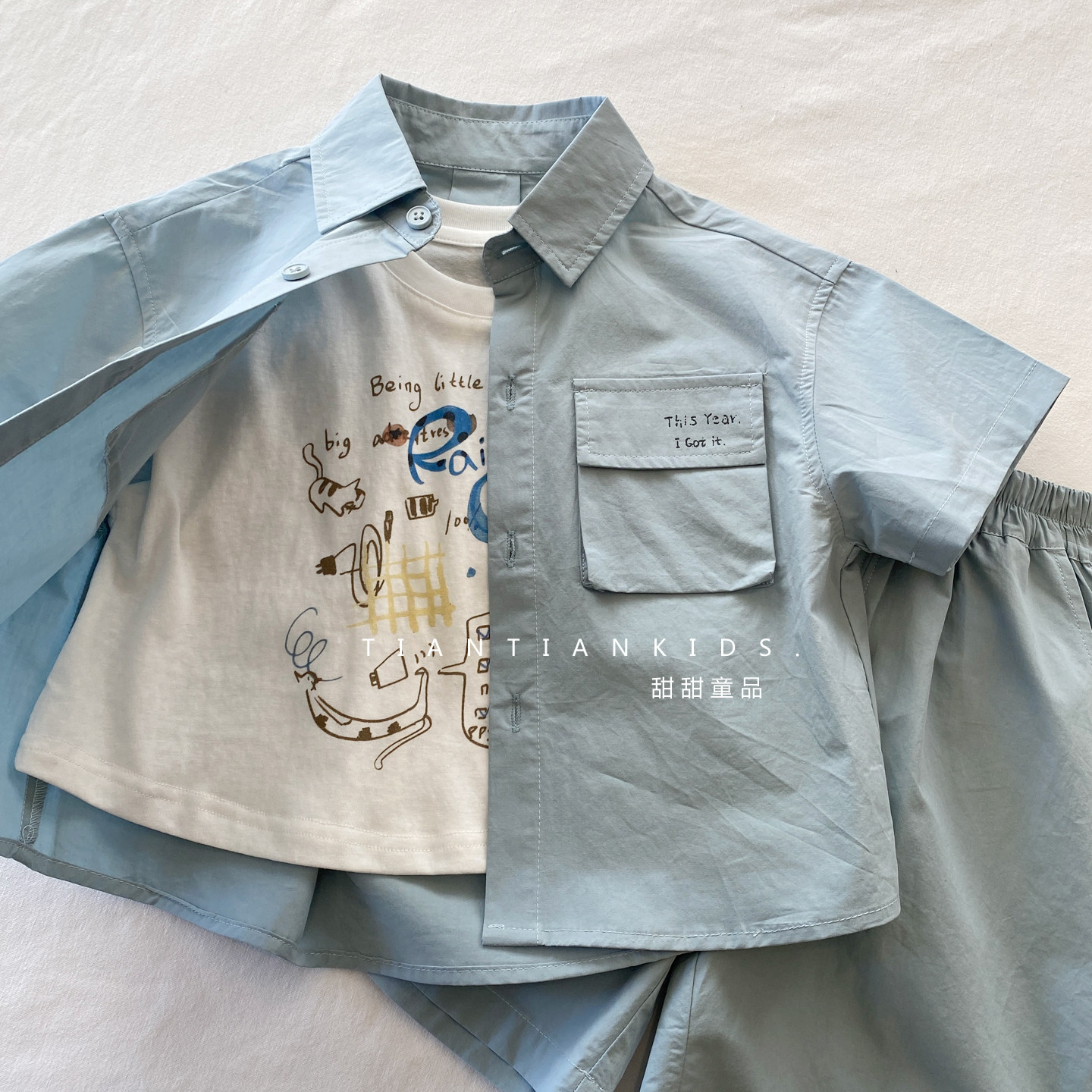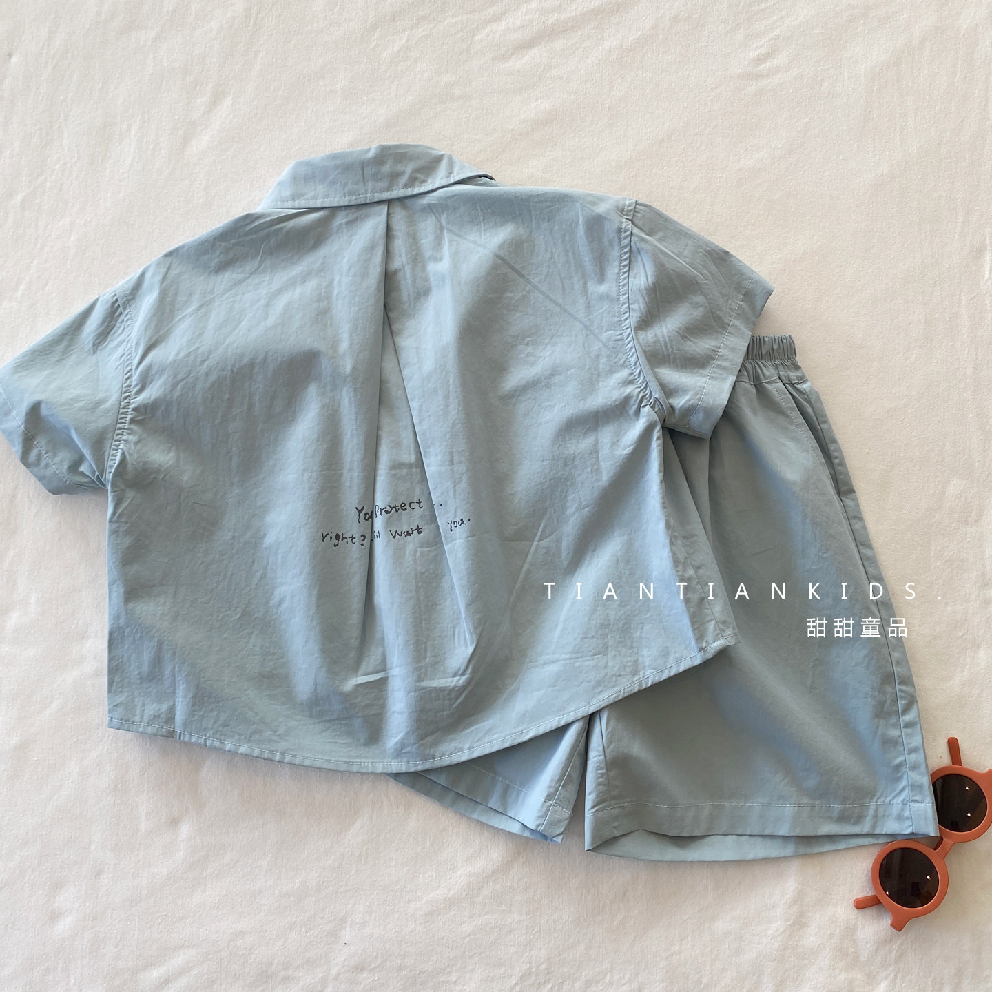 【小童90-130码】蓝色休闲衬衫套装男童翻领短袖短裤夏季新款女童