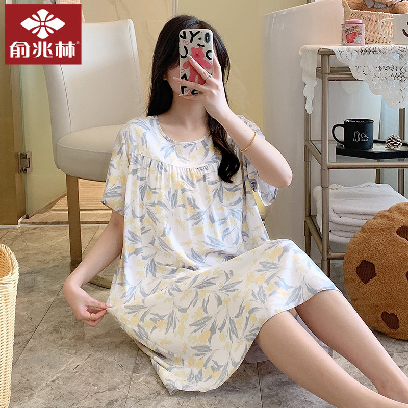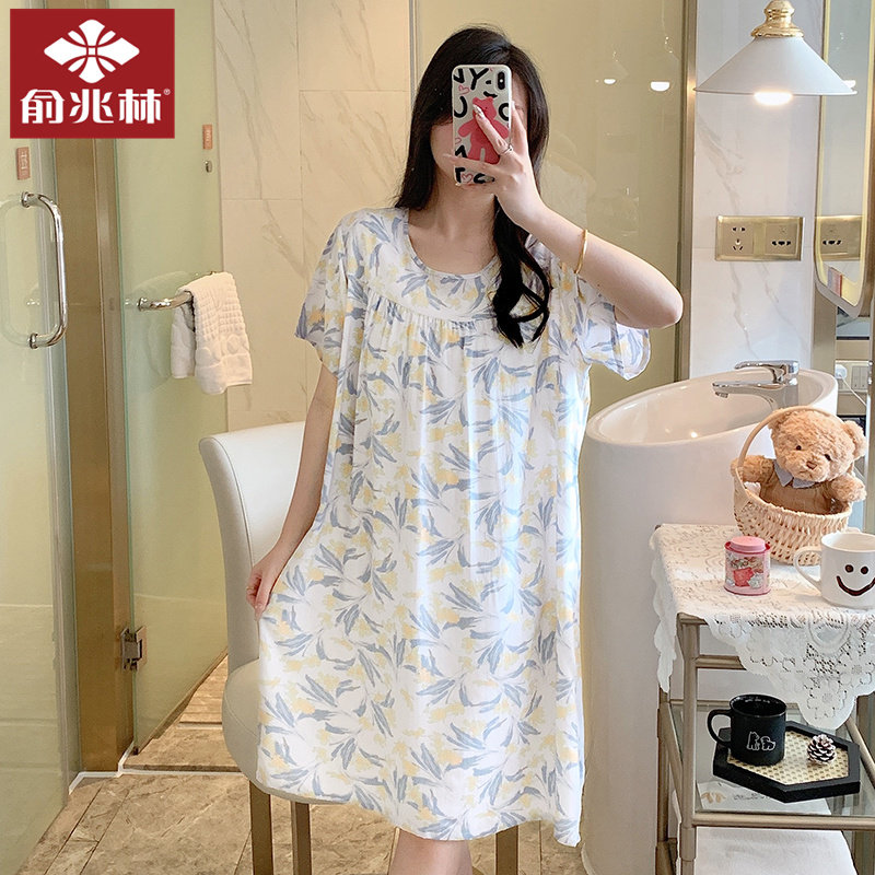 俞兆林夏款棉绸睡裙带胸垫人造棉睡衣女款薄款中长款加肥加大码土