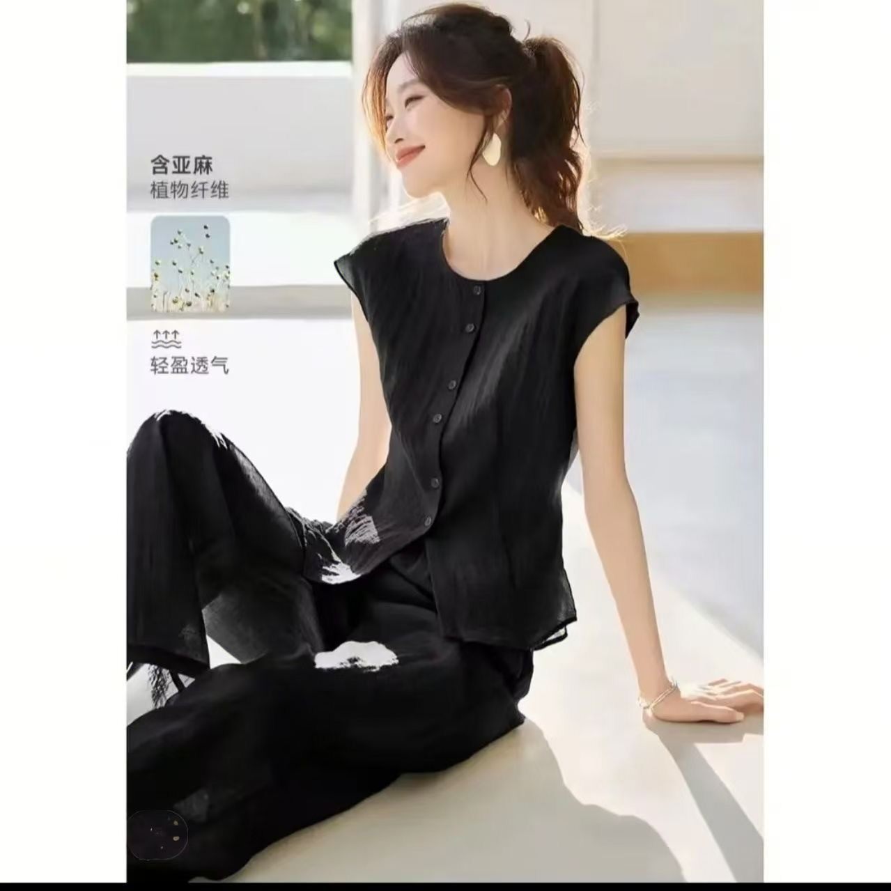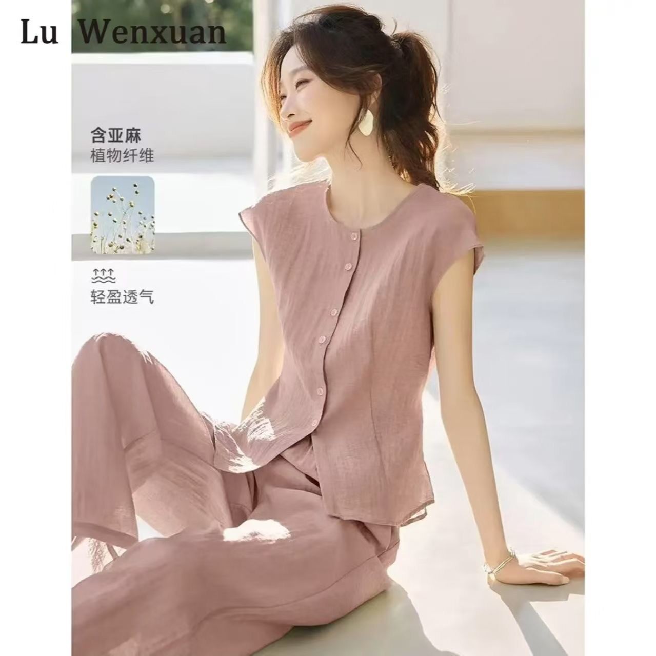 夏天套装女款2026新款蓝色上衣裤子两件套夏季时尚洋气棉麻妈妈装