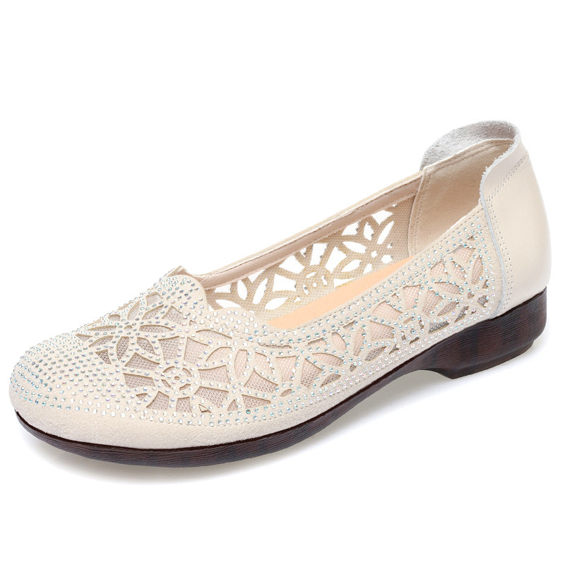 夏天网面透气女鞋网纱单鞋真皮平底镂空凉鞋软底软面牛筋底妈妈鞋