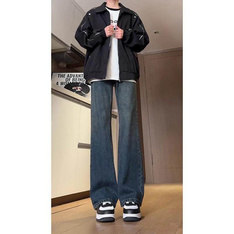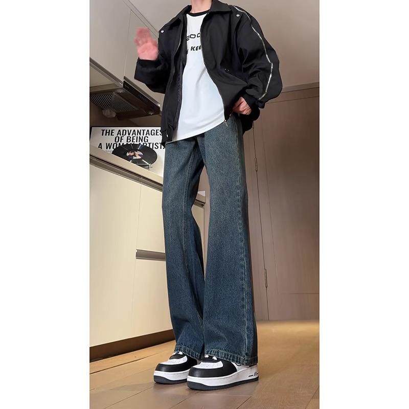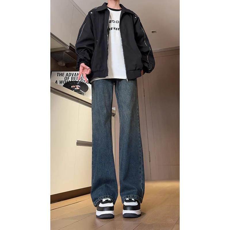 复古深蓝微喇牛仔裤男款直筒高个子美式裤子显瘦显腿长窄版弯刀裤