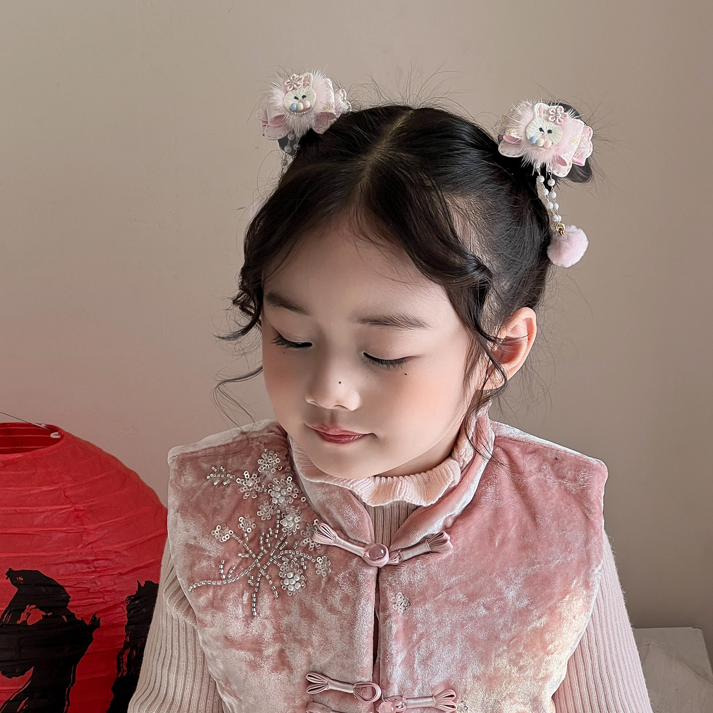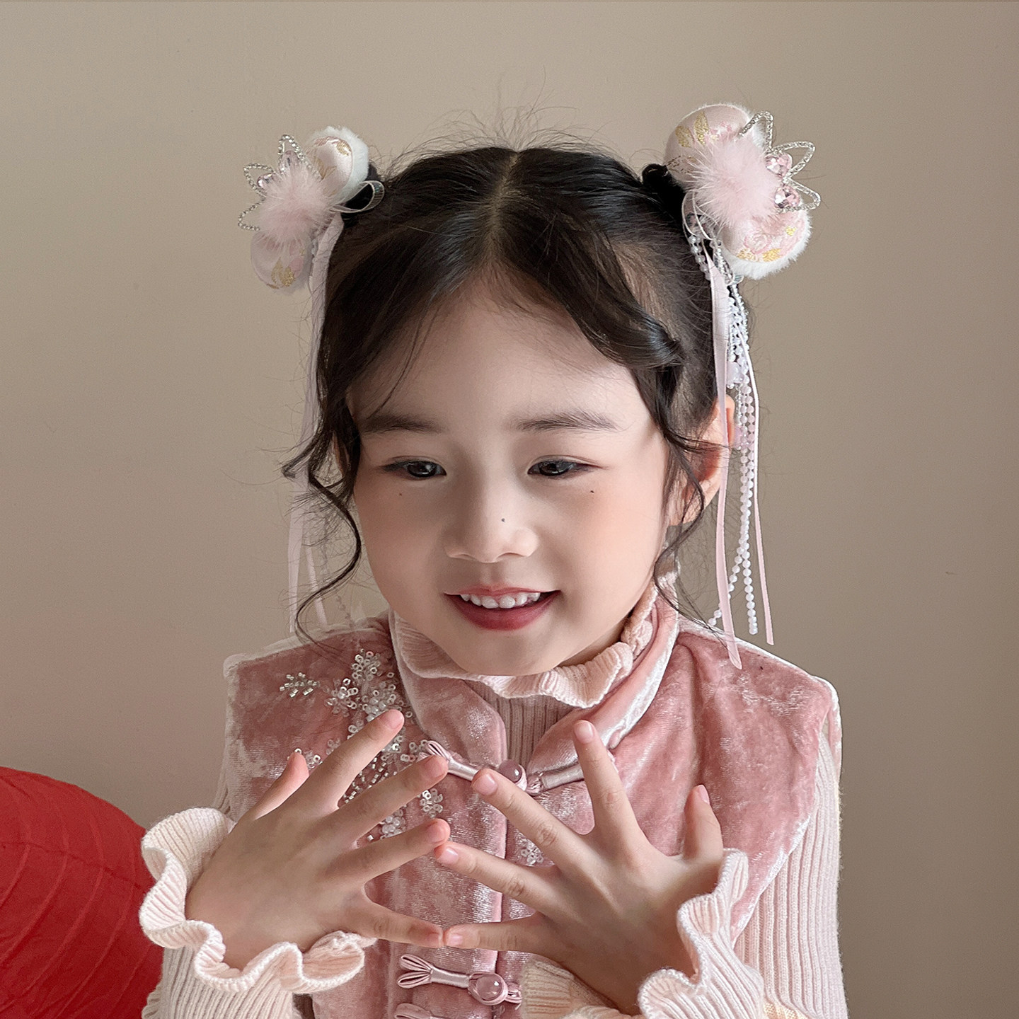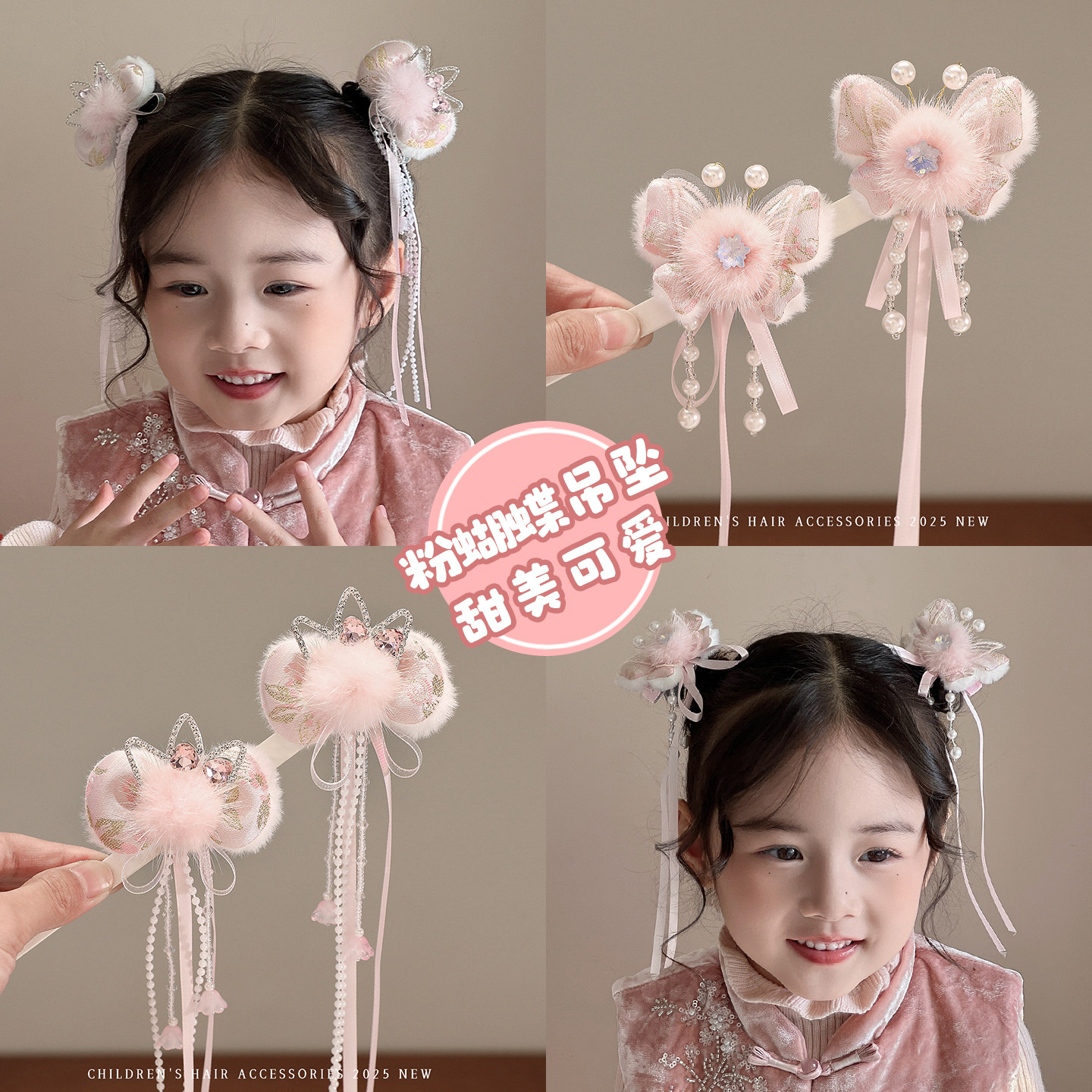 超仙蝴蝶发夹女童古风汉服头饰儿童流苏新年发饰粉色喜庆过年发卡