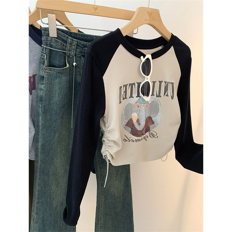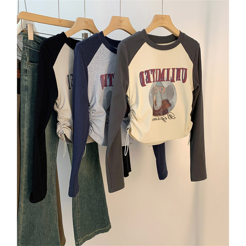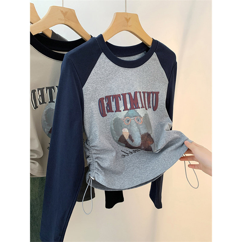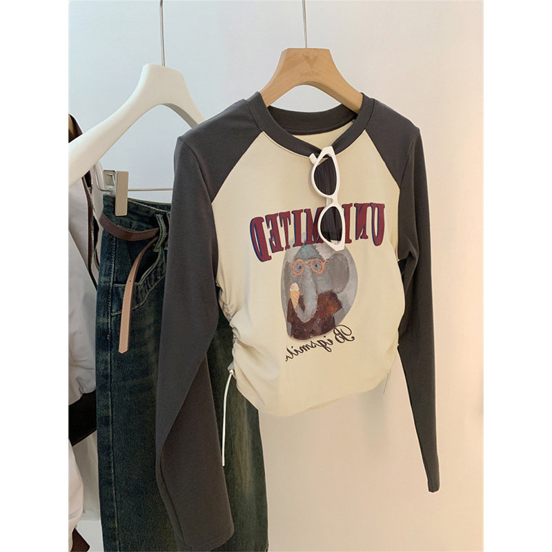 设计感小众拼色抽绳长袖t恤女装2026年新款春款修身短款纯欲上衣