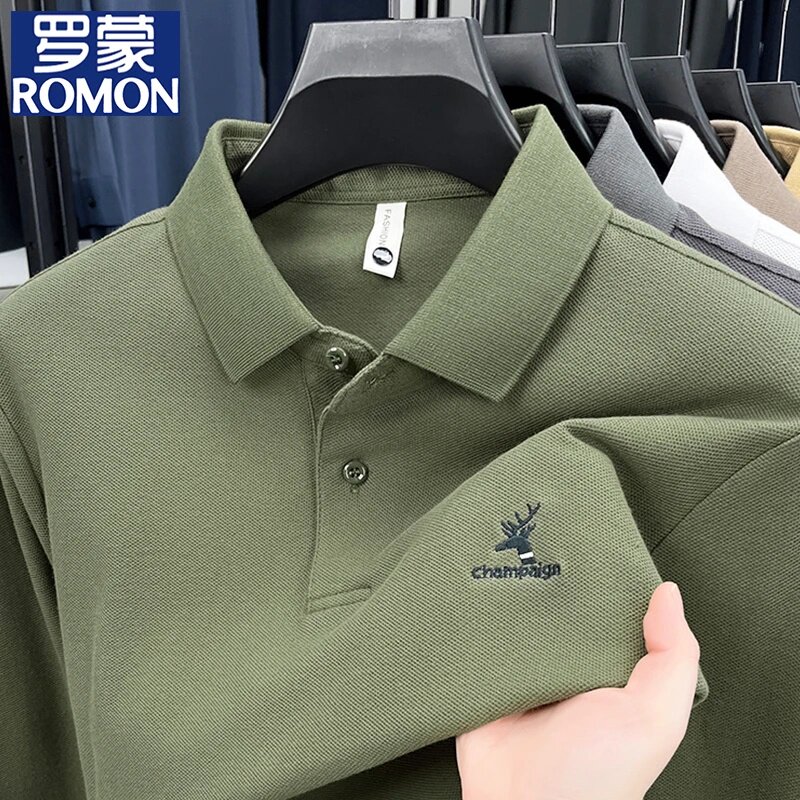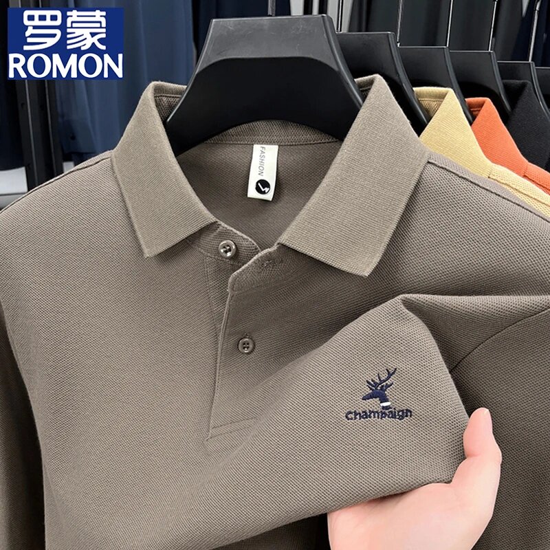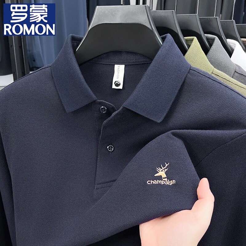 罗蒙纯棉翻领POLO衫男款长袖春秋100%棉刺绣T恤商务休闲打底上衣