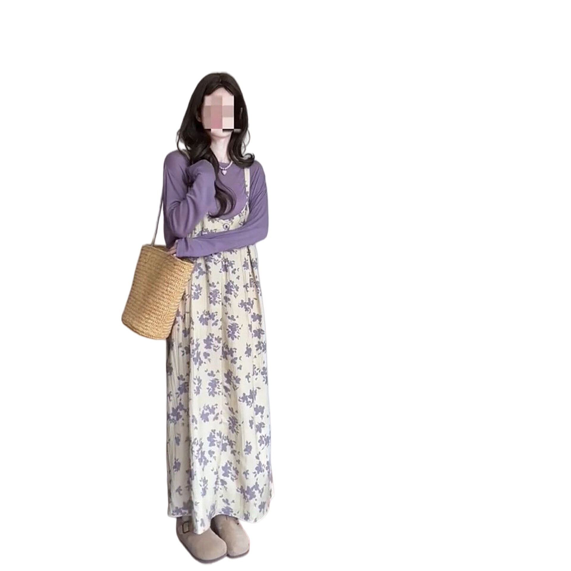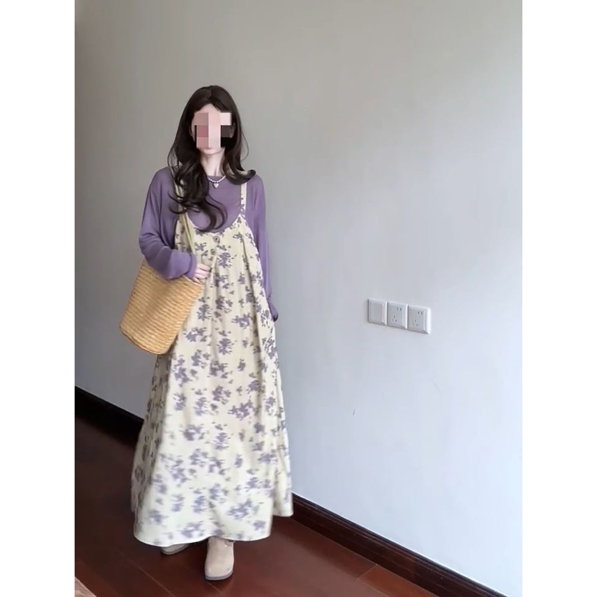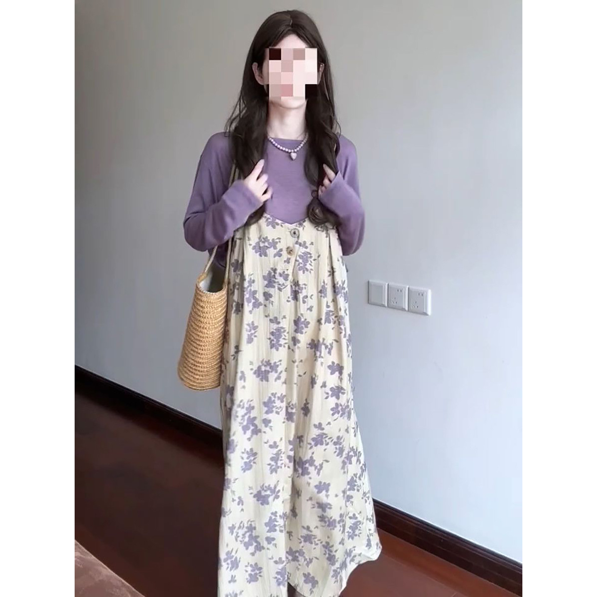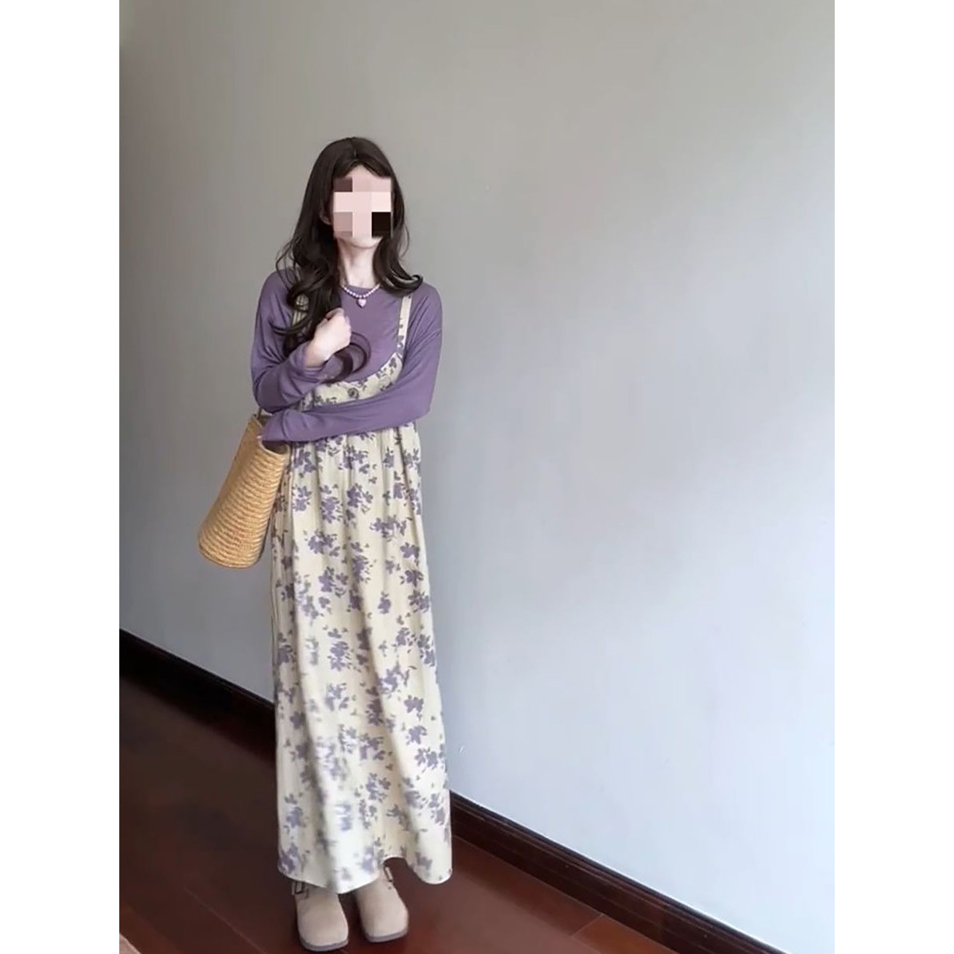 2026春季新款韩系温柔风紫色长袖T恤搭配碎花吊带连衣裙两件套装