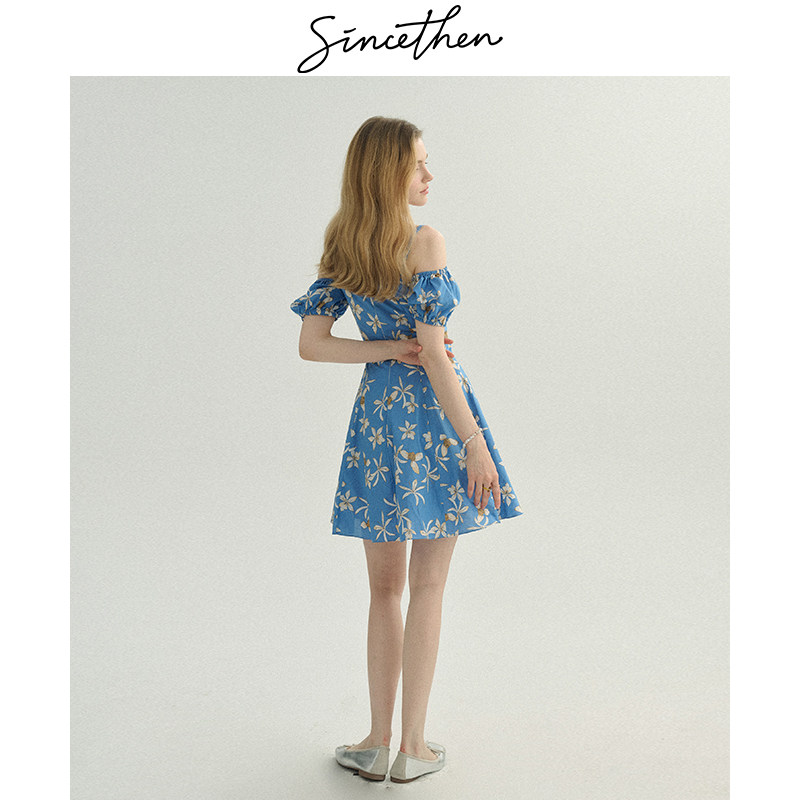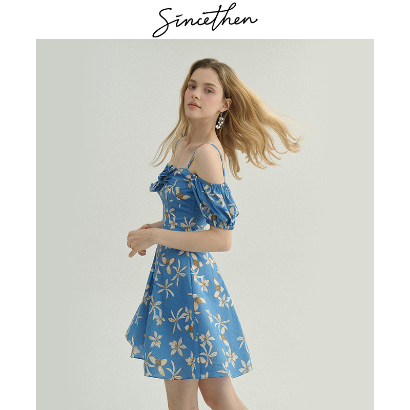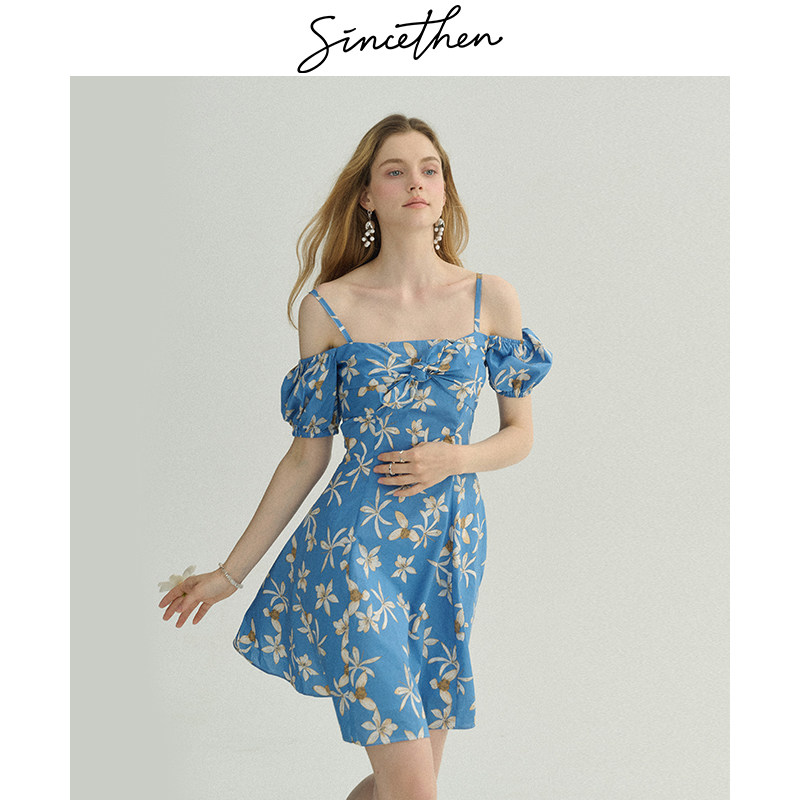 sincethen 法式碎花裙海边度假裙子仙女短裙蓝色短款连衣裙女夏季