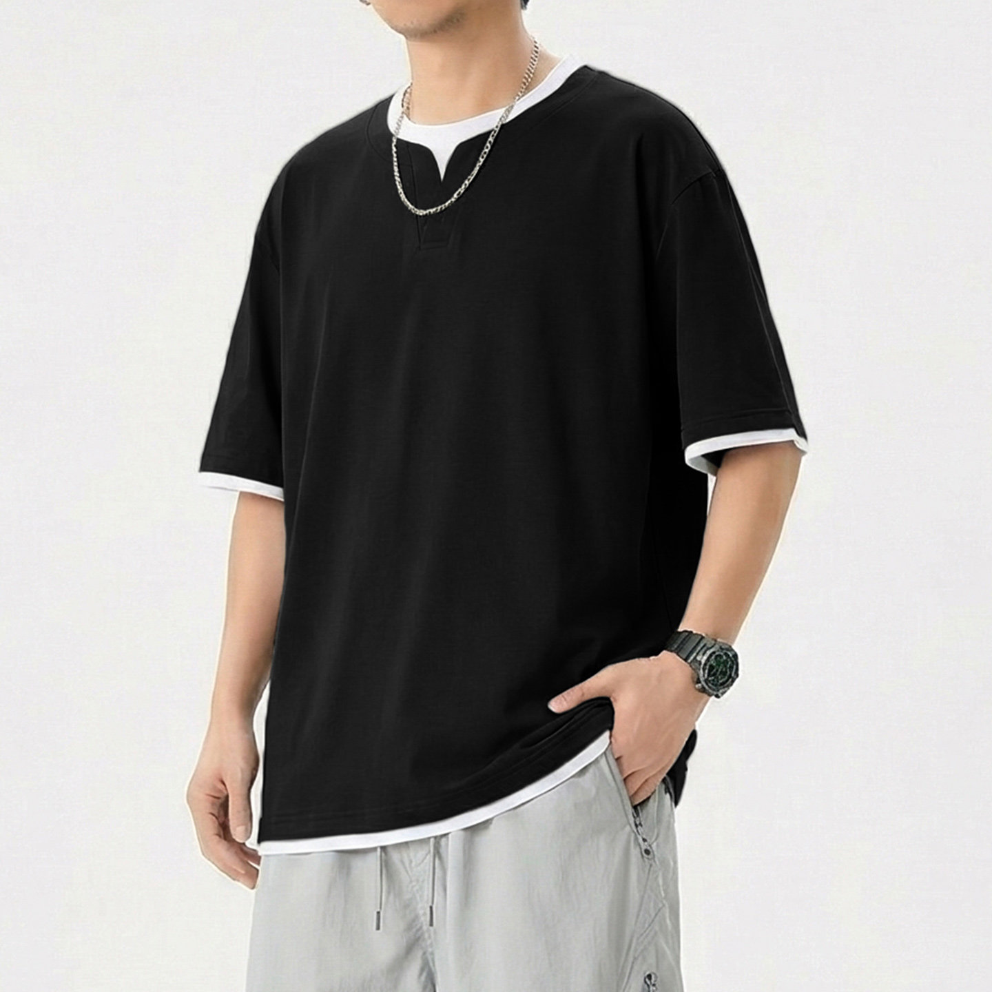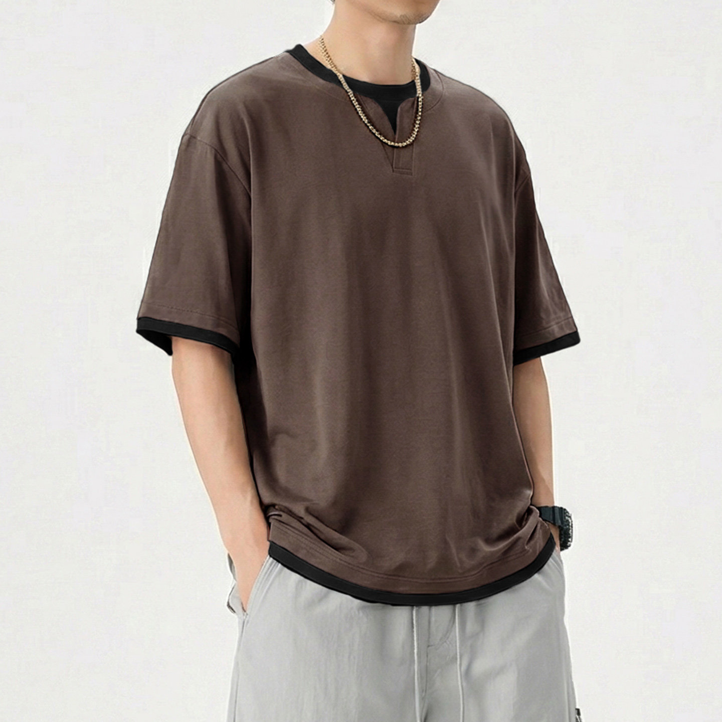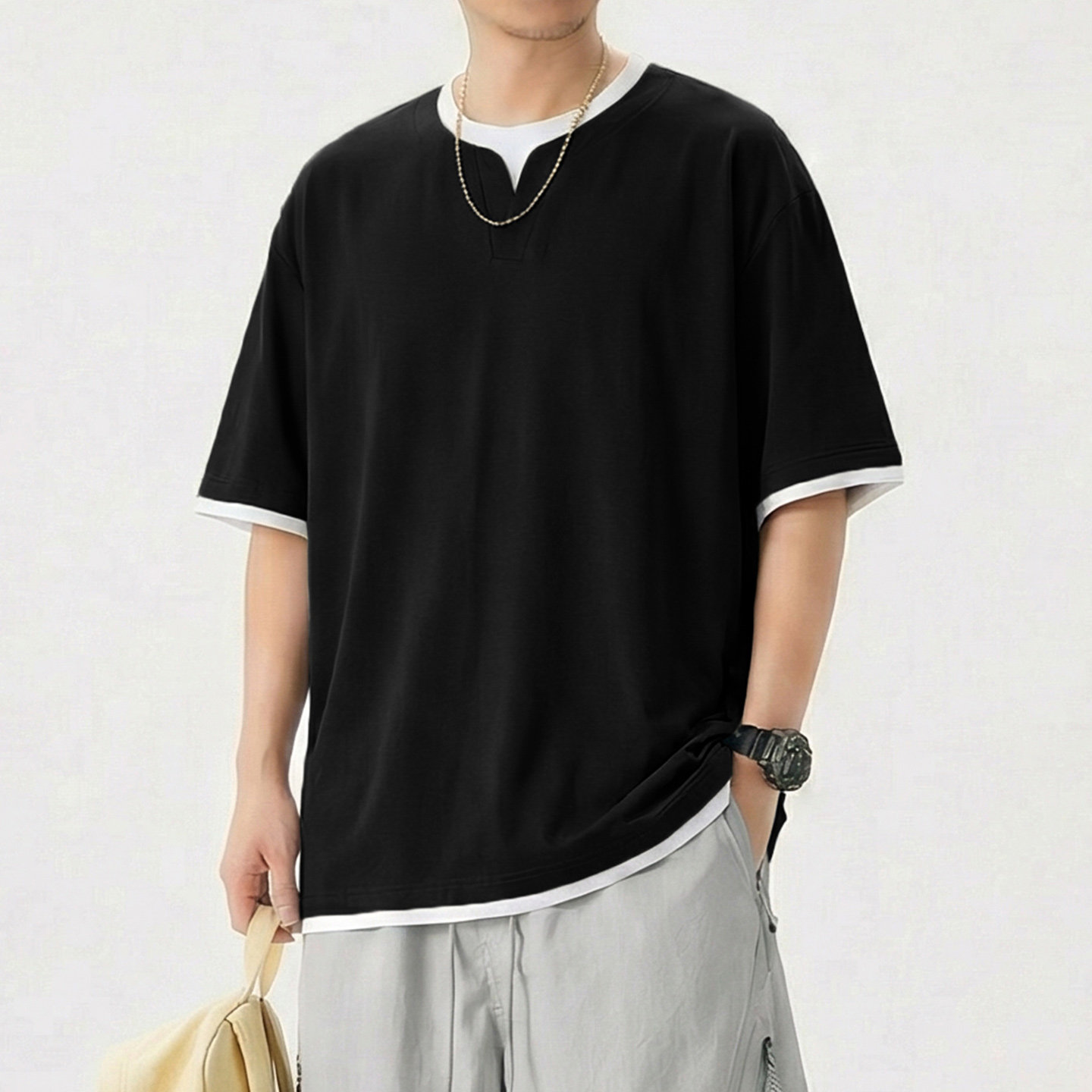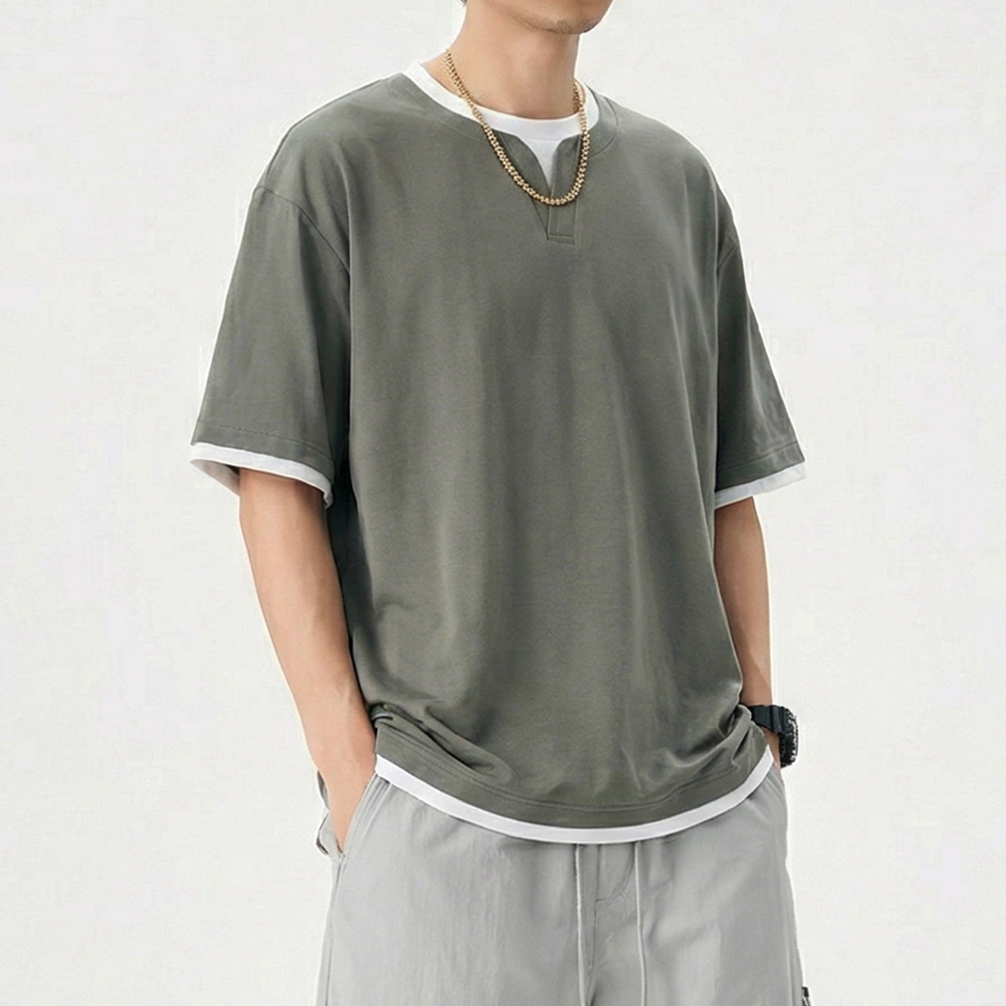加肥加大夏季薄款大码假两件短袖T恤男青少年休闲宽松透气上衣潮