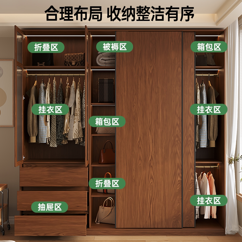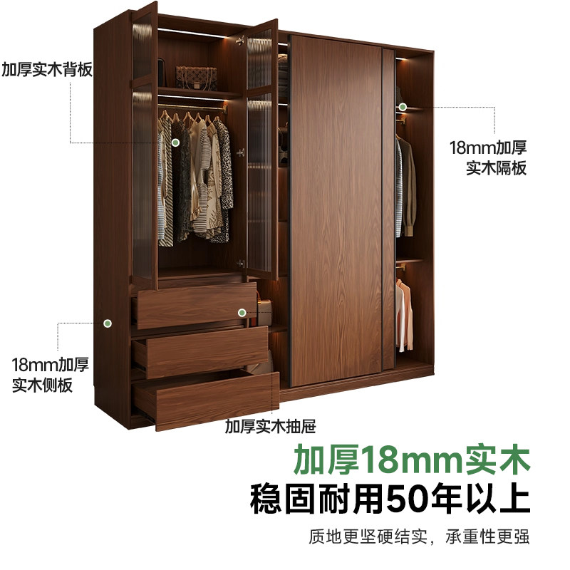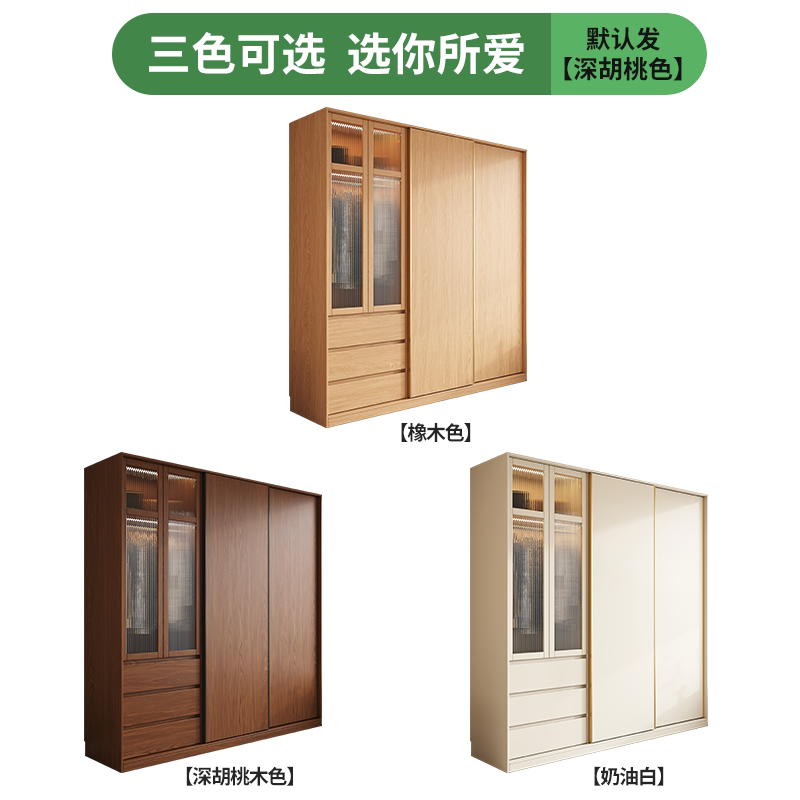 实木定制橡木衣柜推拉门家用卧室小户型中古风玻璃门趟门衣橱