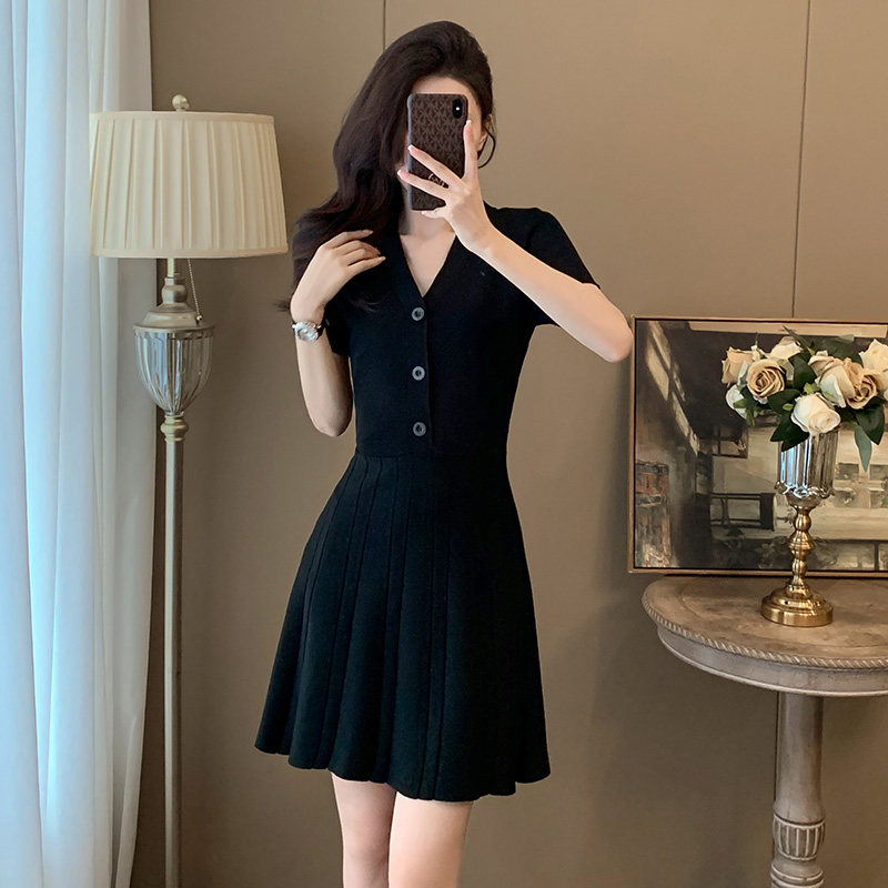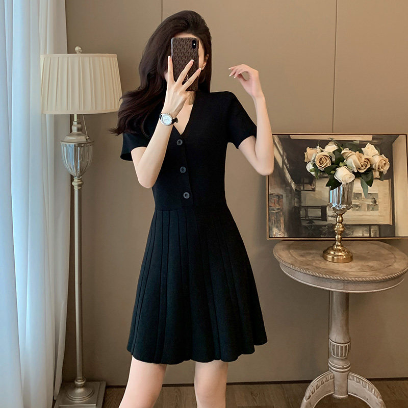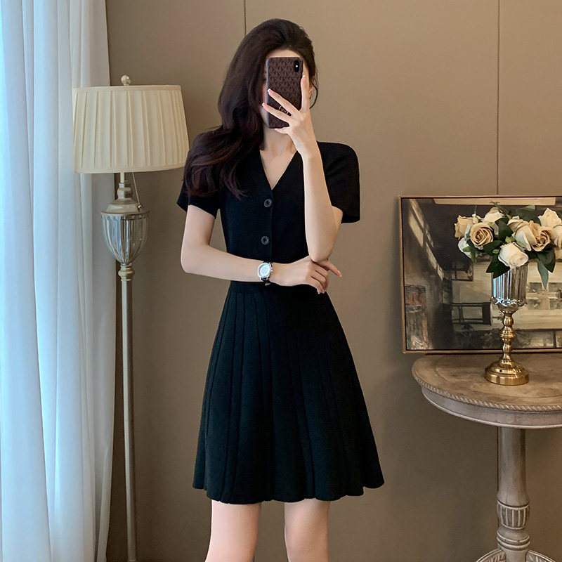 小香风针织连衣裙女夏季高级感小个子收腰显瘦A字裙赫本风小黑裙