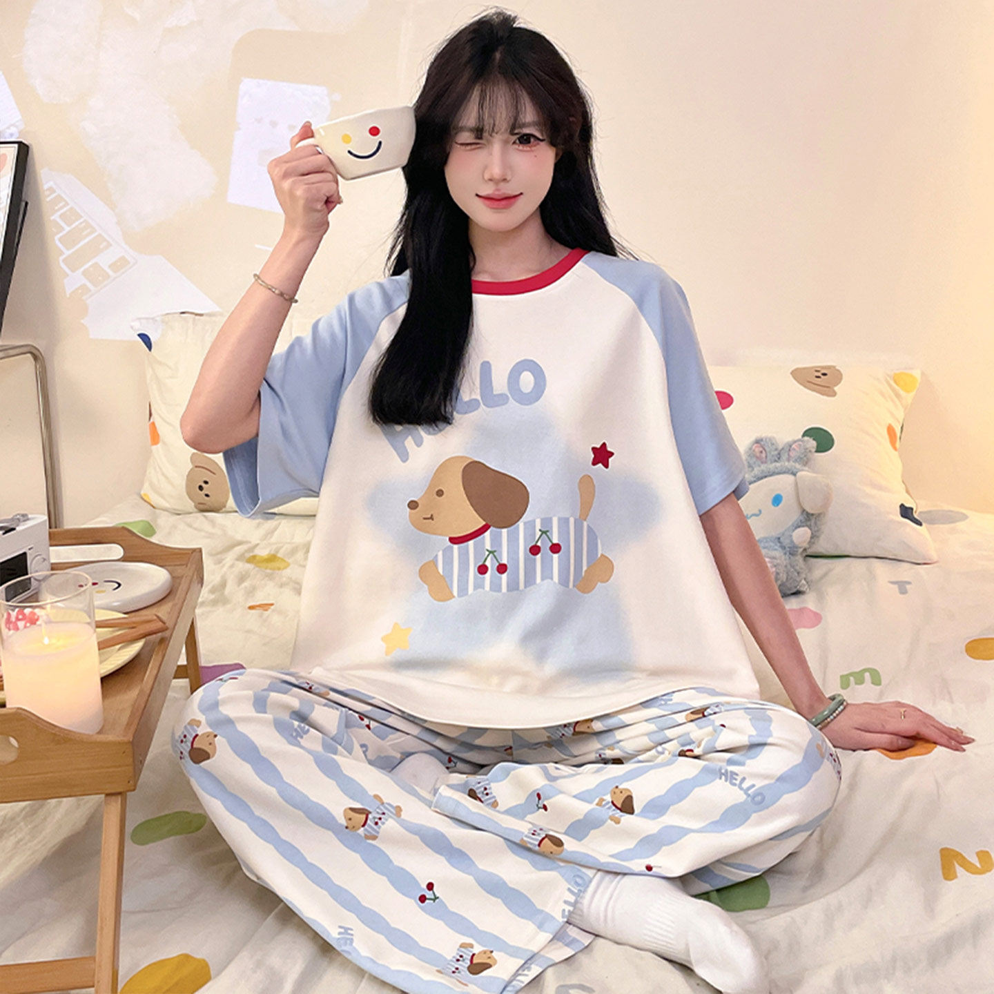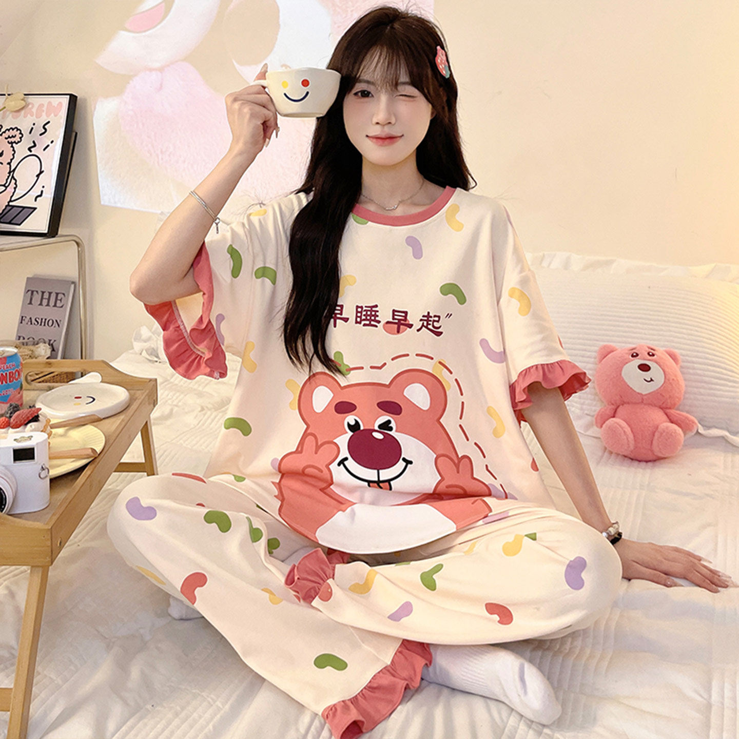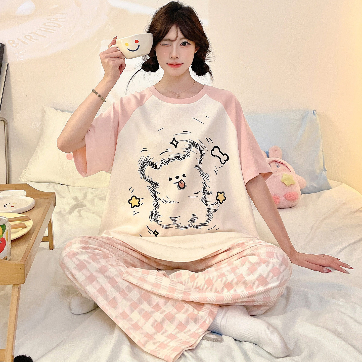纯棉睡衣女款夏季短袖长裤青少年大码卡通可爱初中学生夏天家居服