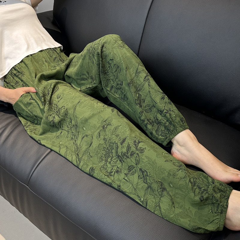 加长大码棉绸睡裤女士夏季薄款人造绵绸可外穿家居碎花长裤子宽松