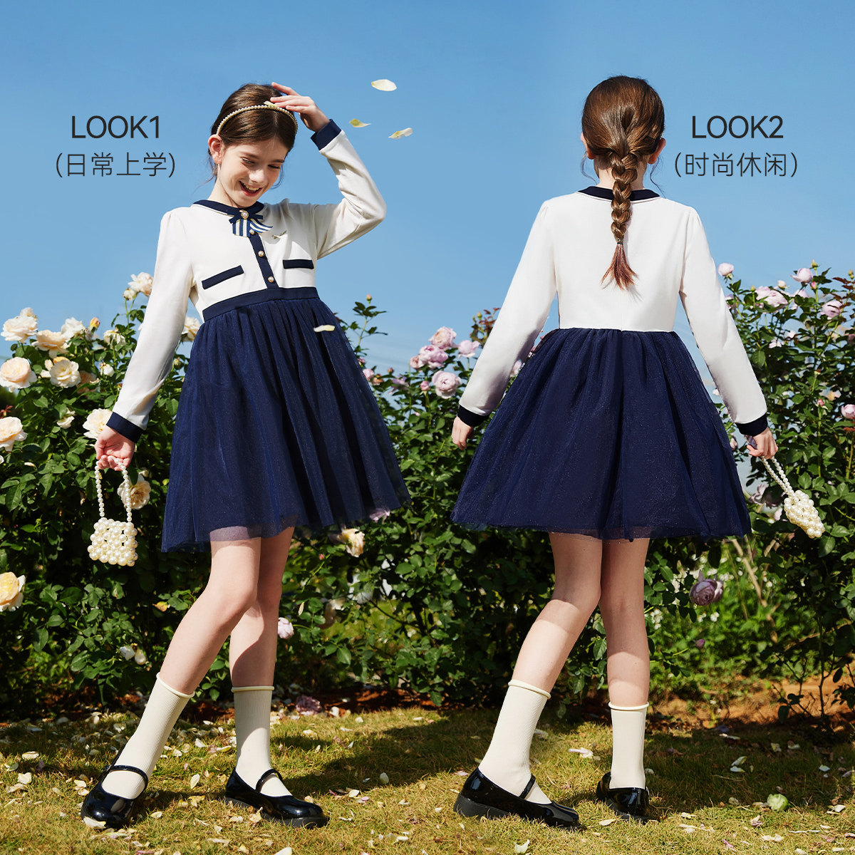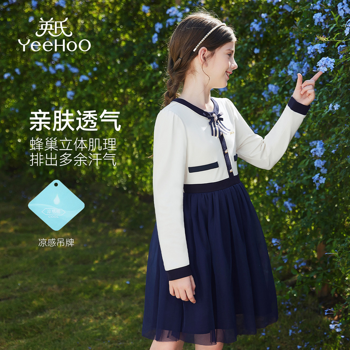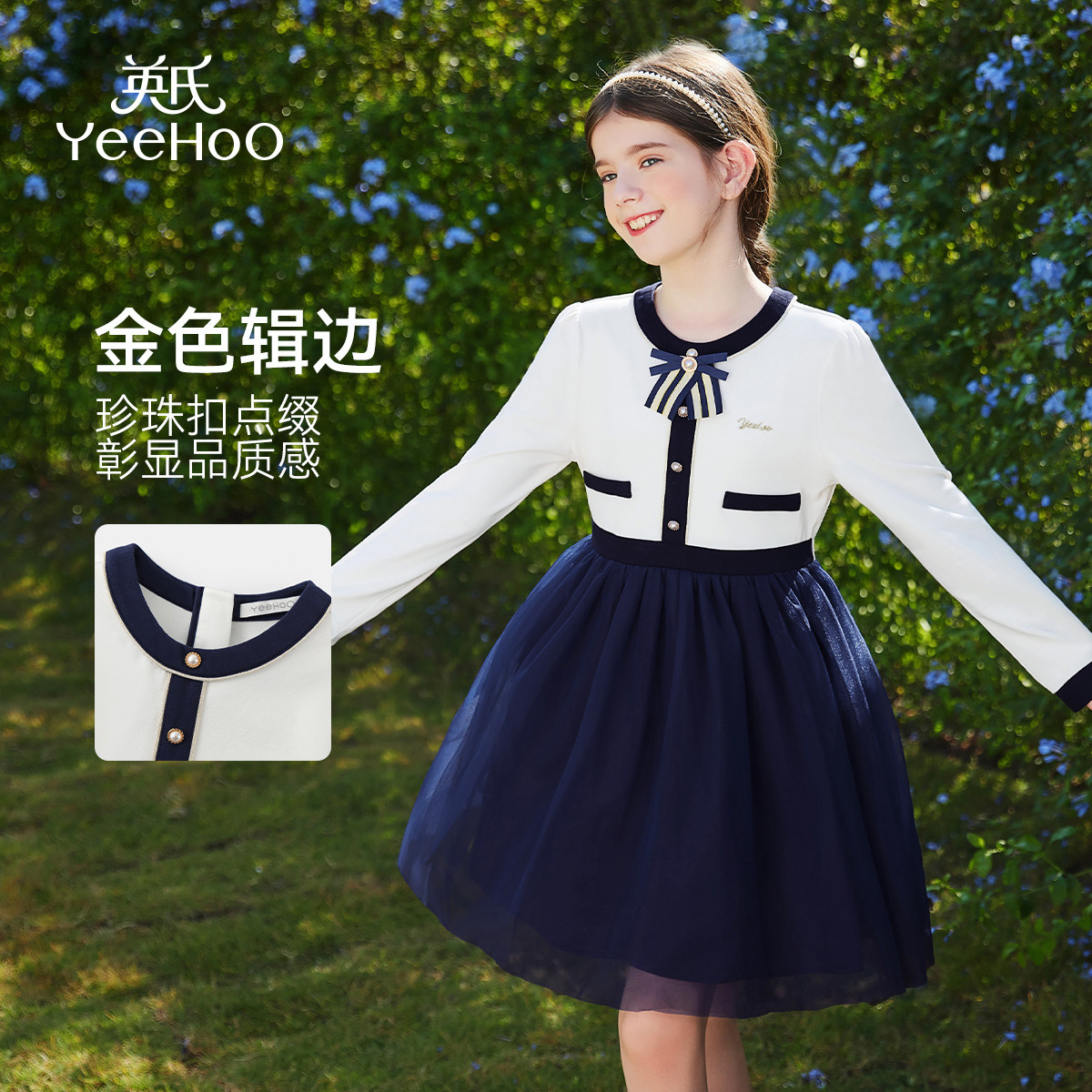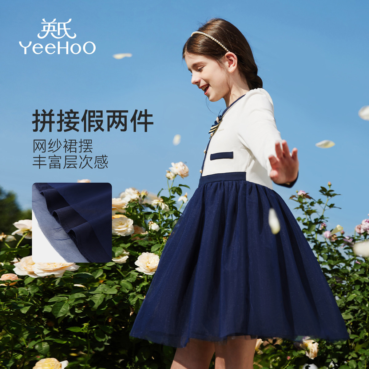 英氏女童连衣裙2026新款春季长袖中大童装拼接网纱洋气公主裙子潮