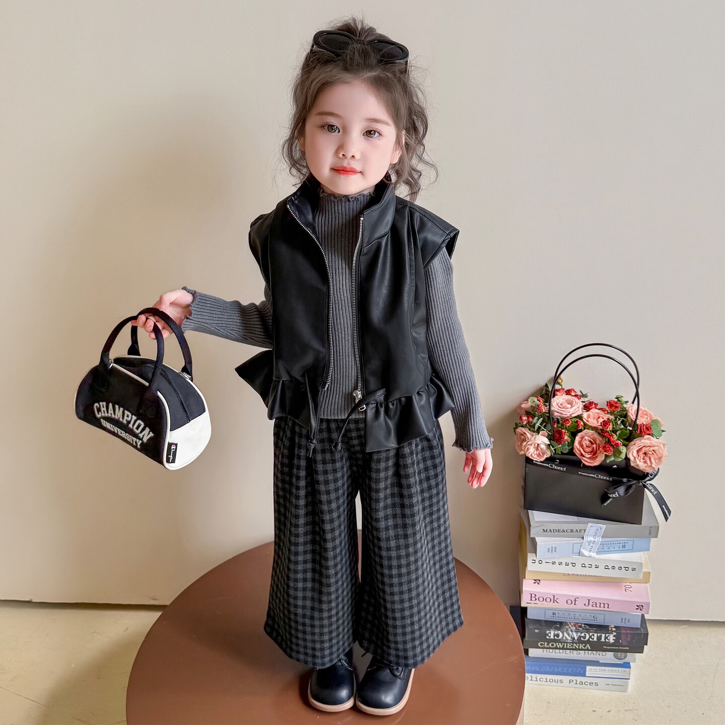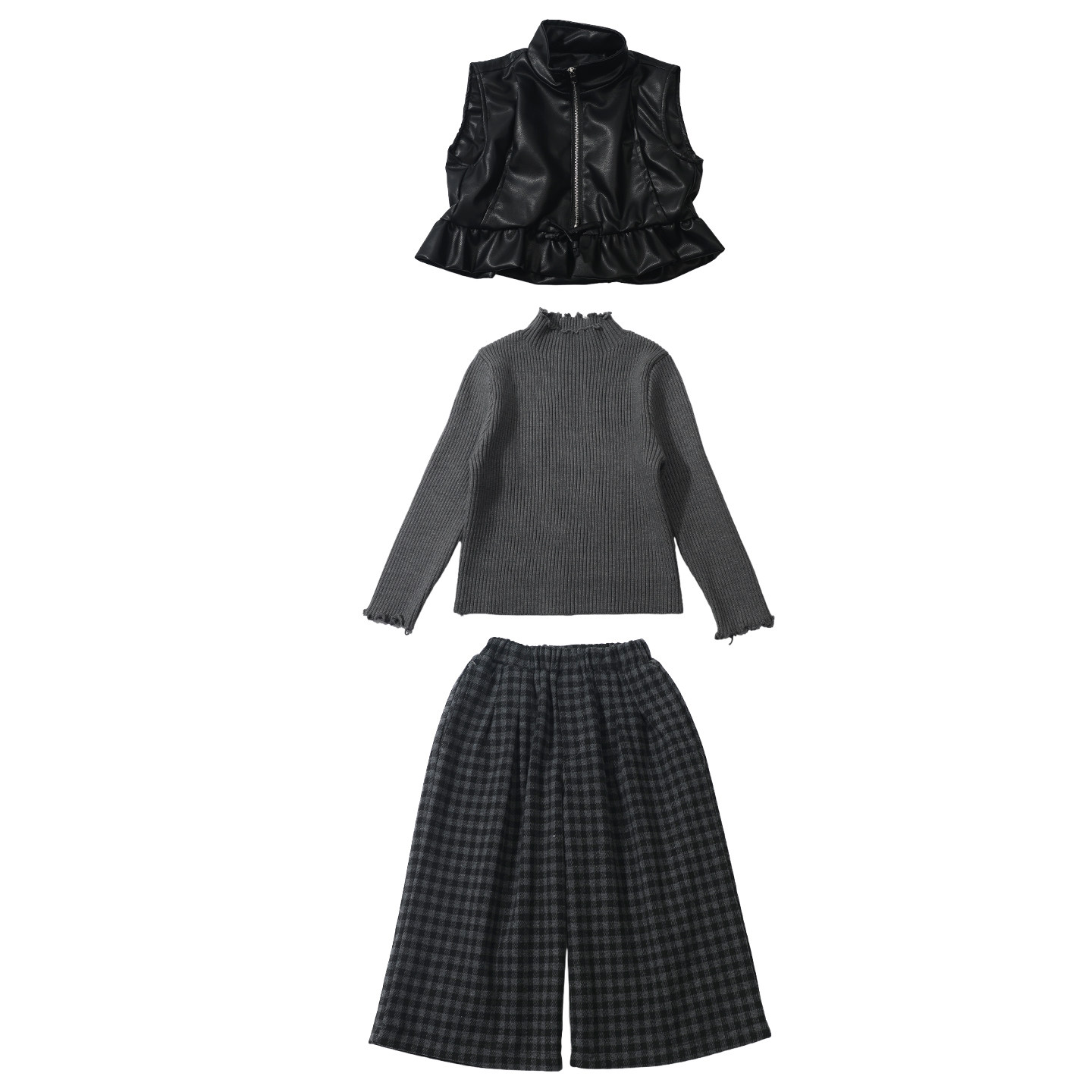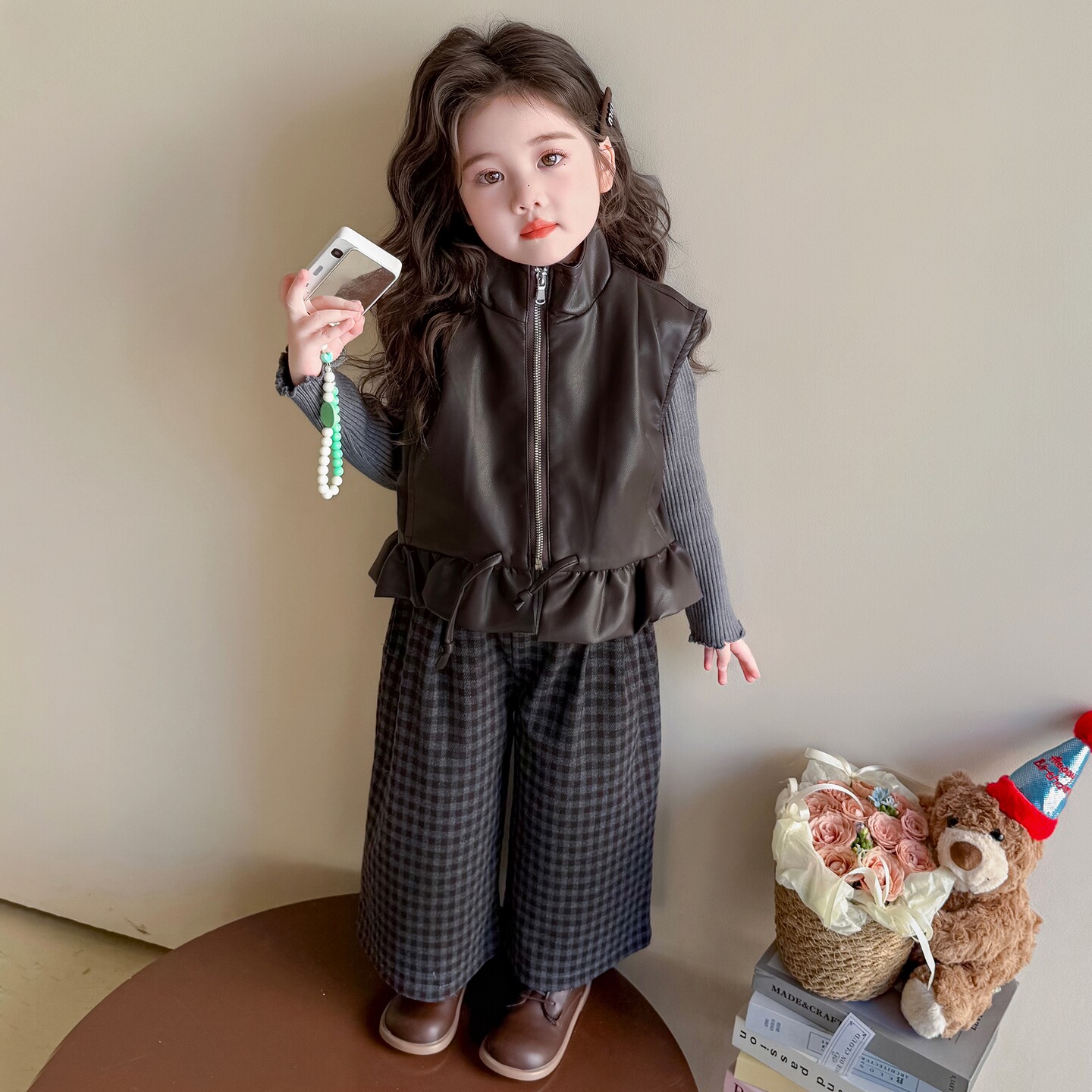 女童秋套装2025新款洋气时髦儿童皮衣马甲格子阔腿裤三件套春秋款