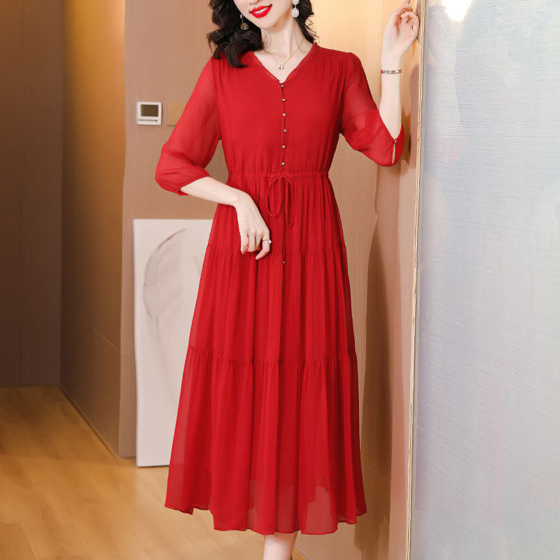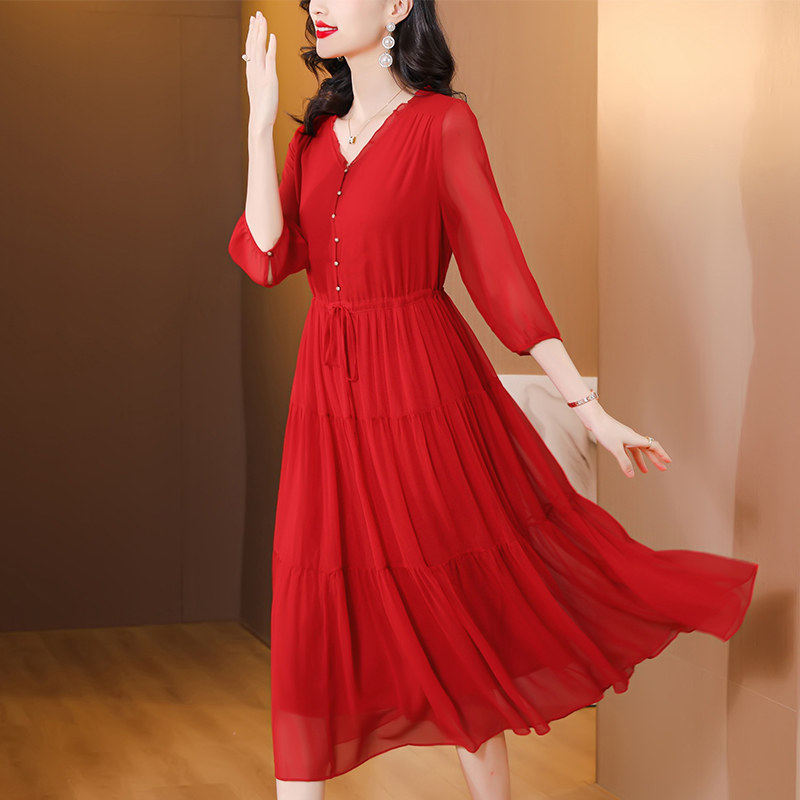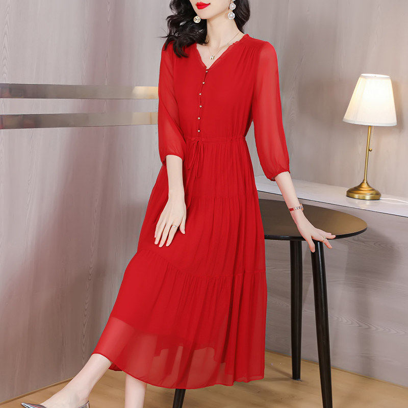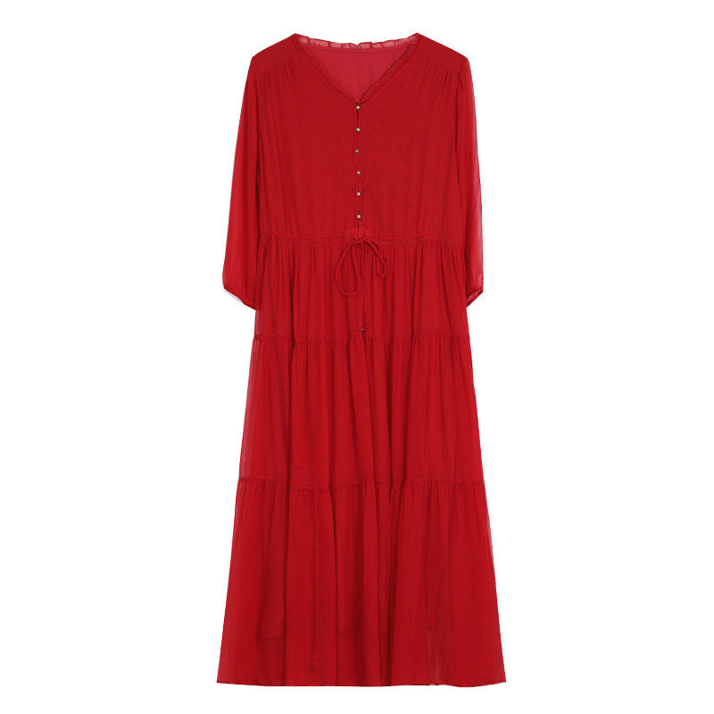 红色真丝桑蚕丝连衣裙女2026夏季新款轻奢高级感显瘦香云纱长裙子
