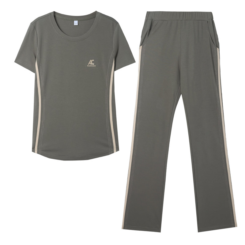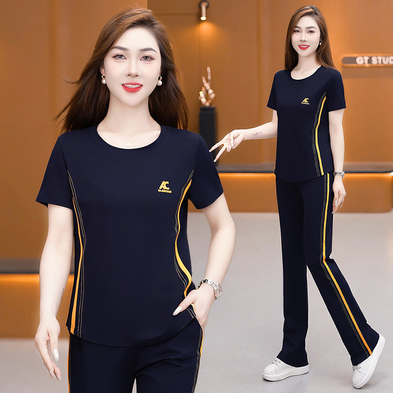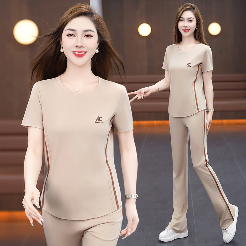 冰丝圆领运动套装女中年妈妈夏小个子修身显瘦短袖长裤休闲两件套